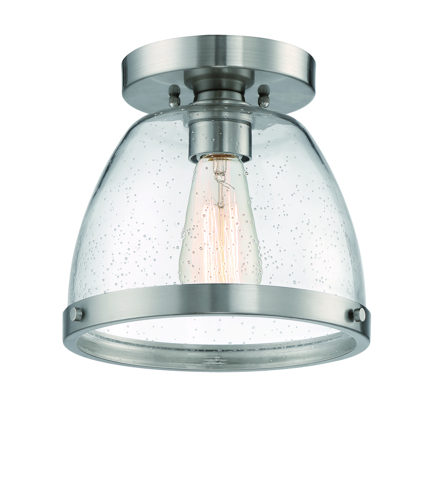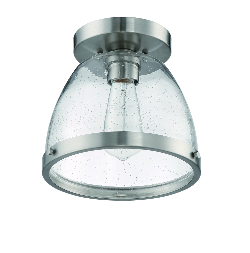 Light illuminates the clear seeded glass shade of these flushmounts from our Lodie Collection . Featuring two sizes offered in three finishes, the Lodie Flushmount Collection offers the clean transitional styling and excellent light without all the fuss.