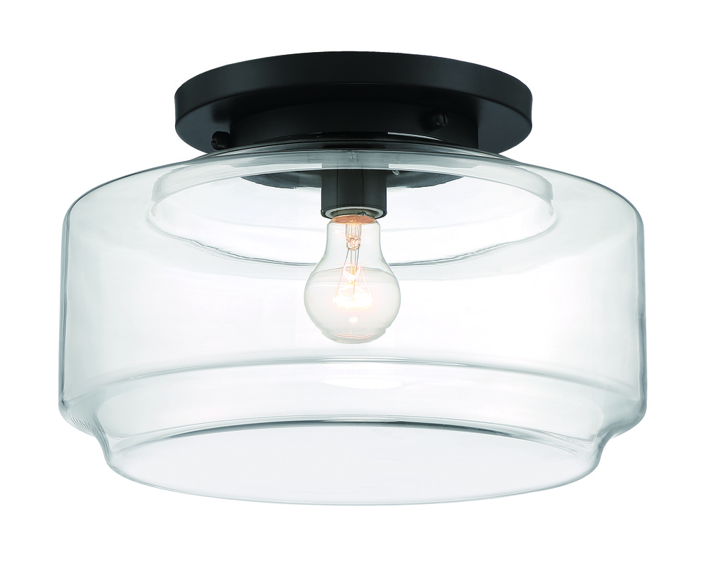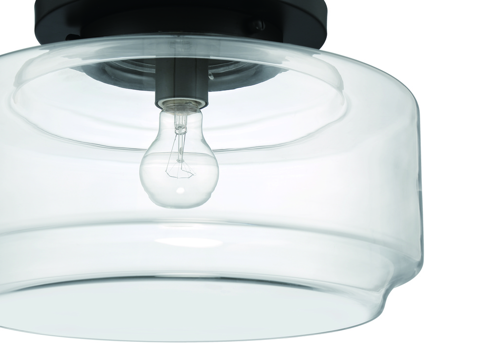 The Peri Collection , inspired by classic schoolhouse lights, features a wide clear glass globe in a familiar yet updated shape. Finished in your choice of brushed polished nickel, flat black or satin brass, these flushmounts are available in 12" and 14" diameter and each uses a single 60W medium base bulb.