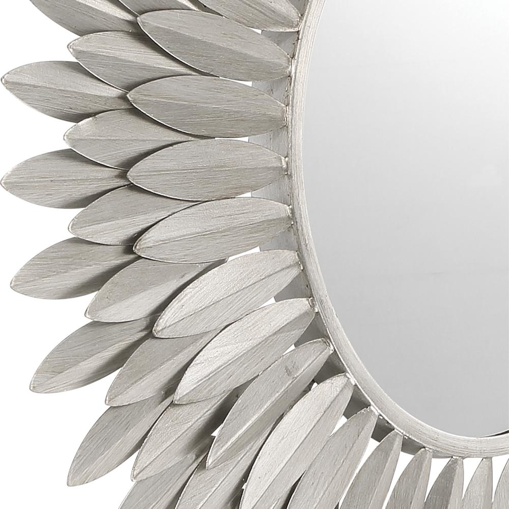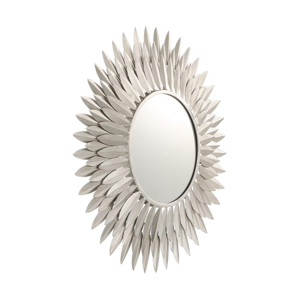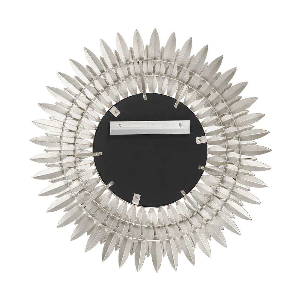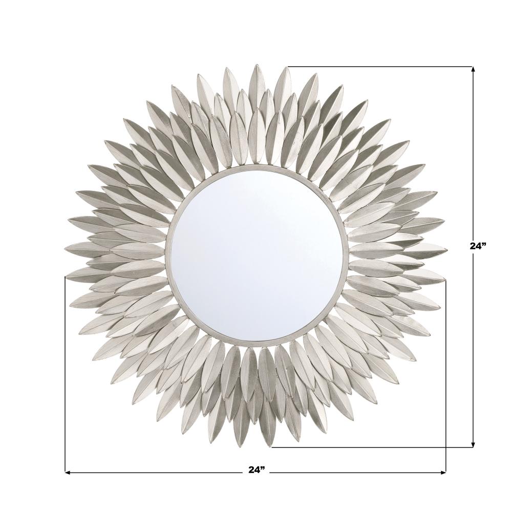 Inspired by Crystorama’s iconic Broche Collection, this stunning mirror brings sculptural artistry to wall décor. The mirror features a radiant sunburst design with hand-forged metal leaves arranged to evoke elegance and organic beauty. The intricate leaf-shaped detailing channels a refined sense of nature-inspired aesthetics, adding warmth and charm to any interior. This mirror is ideal as a focal point in entryways, living rooms, or bedrooms, and it pairs beautifully with contemporary and classic design styles.