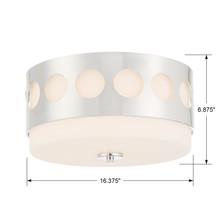 The drum-shaped Kirby ceiling mount sends focused light to a space. A perfect choice for low ceilings, the solid white glass, and circular geometric metal overlay pattern is a stylish choice for various spaces.