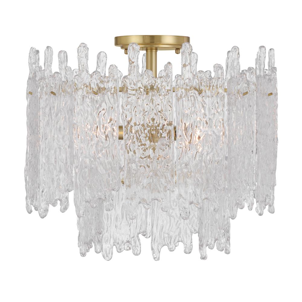 The Ackerly Collection showcases stunning ice glass, a textured material that resembles frozen or cracked ice. Its frosted, crystalline surface uniquely scatters light, producing a soft, diffused glow. This organic, sculptural effect adds a modern yet slightly retro touch to the design. The Ackerly Collection combines elegance with an artistic, edgy aesthetic, making it a standout in any space.