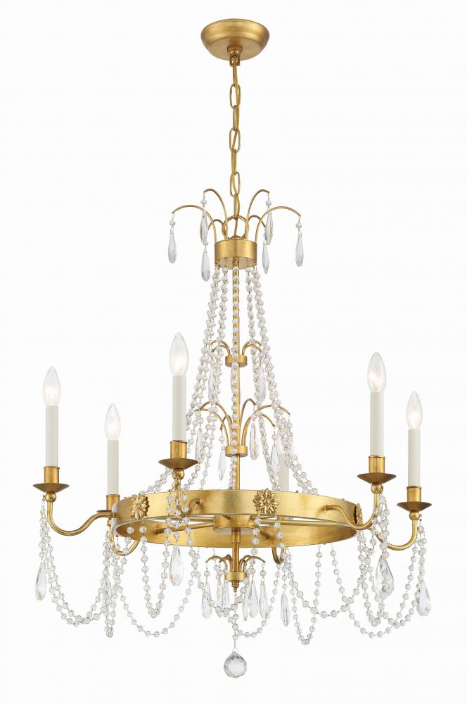 The Maizey Collection is a testament to refined elegance and meticulous craftsmanship. Each piece is adorned with a lustrous gold finish, delicately supporting clear, smooth glass beads alongside faceted cut crystal drops, imparting a mesmerizing sparkle to any space. Accentuated with a distinctive sunburst emblem, this fixture serves as a radiant illuminator and captivating work of art.