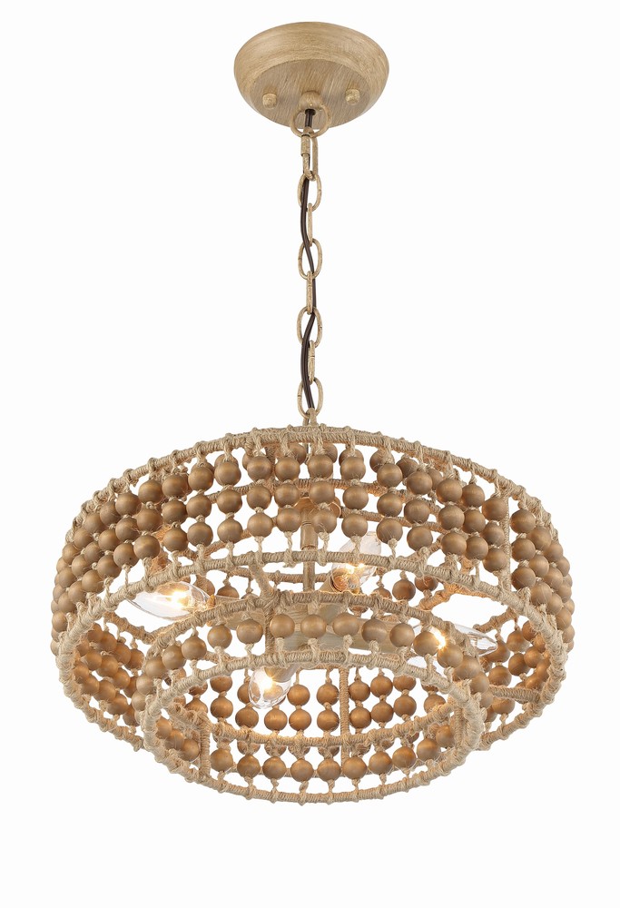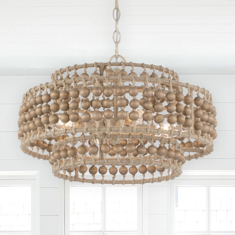 The Silas interlaces natural wood beads with jute rows, bringing an organic element to its environment. A series of beads are strung together, taking on a handmade aesthetic that creates an inviting and casual style to a room.