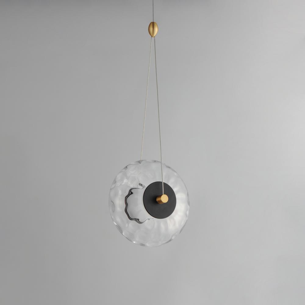Circular bands, like ornaments, descend from thin low voltage cables in a variety of configurations. An evenly diffused LED tube spans the distance of the circular wavy glass shades creating a dazzling lighting effect. A contrasting two-tone Black and Natu
