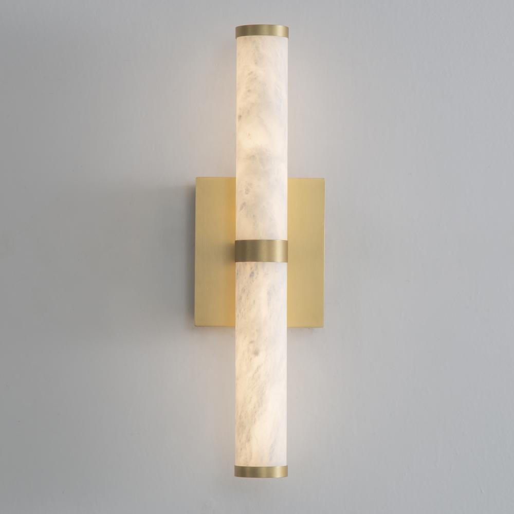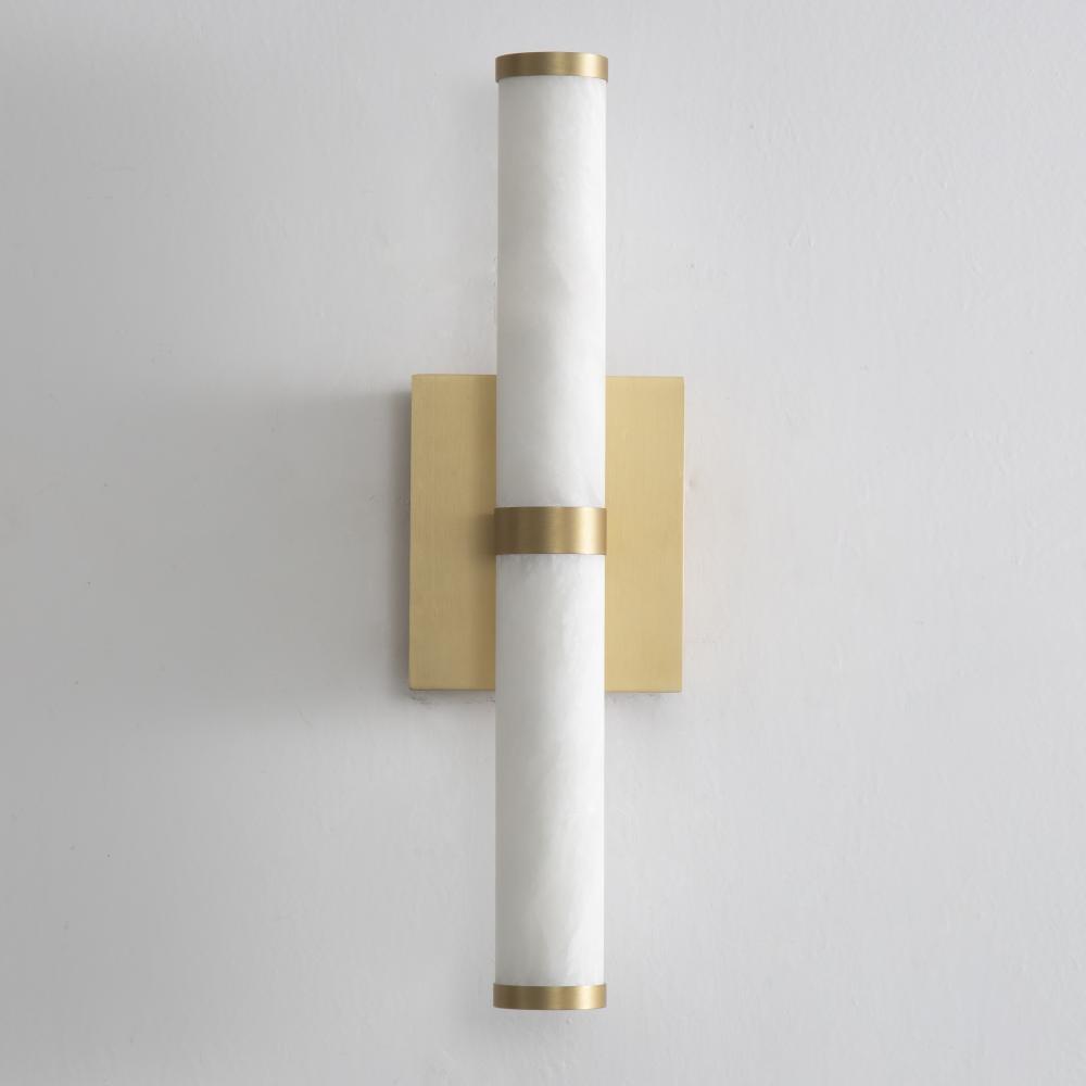 Featuring carved Spanish Alabaster shades in sleek cylindrical forms, the Aragon collection conceals high-powered LED light sources within, providing both beauty and functionality. The natural alabaster is elegantly complemented by plated Gold accents, add