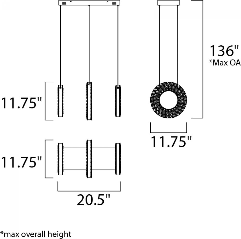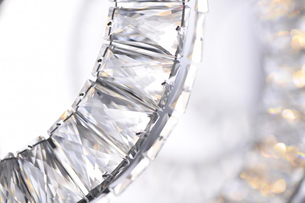 Rings of Beveled Crystals are mounted into a Polished Chrome band and suspended from cable as if they were floating in air. Multiple size rings mounted in descending order create a unique and brilliant light form which is sure to be the focal point of the