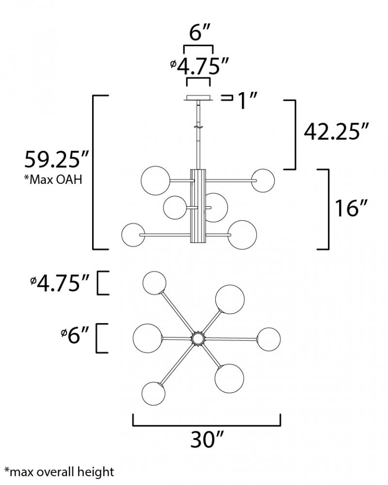A scalloped aluminum extrusion is finished in Black with intersecting arms of Satin Nickel which support Satin White glass globes illuminated by LED G9 lamps that are included.