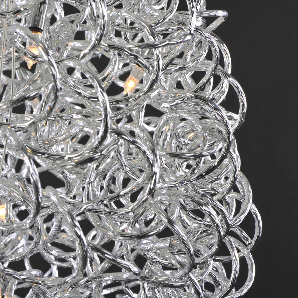 Sculptures created from Polished Chrome aluminum rods are formed by hand into a mod-silhouette, perfect for loft living and cosmopolitan lifestyles. Woven through the interior are strings of clear G4 Xenon lamps that add sparkle as they reflect off of the