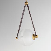 Send a message on the wire. Two semi-spherical frosted glass domes are separated by a tube of LED light and suspended by Tobacco Brown leather straps. The frames are complete in a contrasting Natural Aged Brass finish making the contemporary design softer
