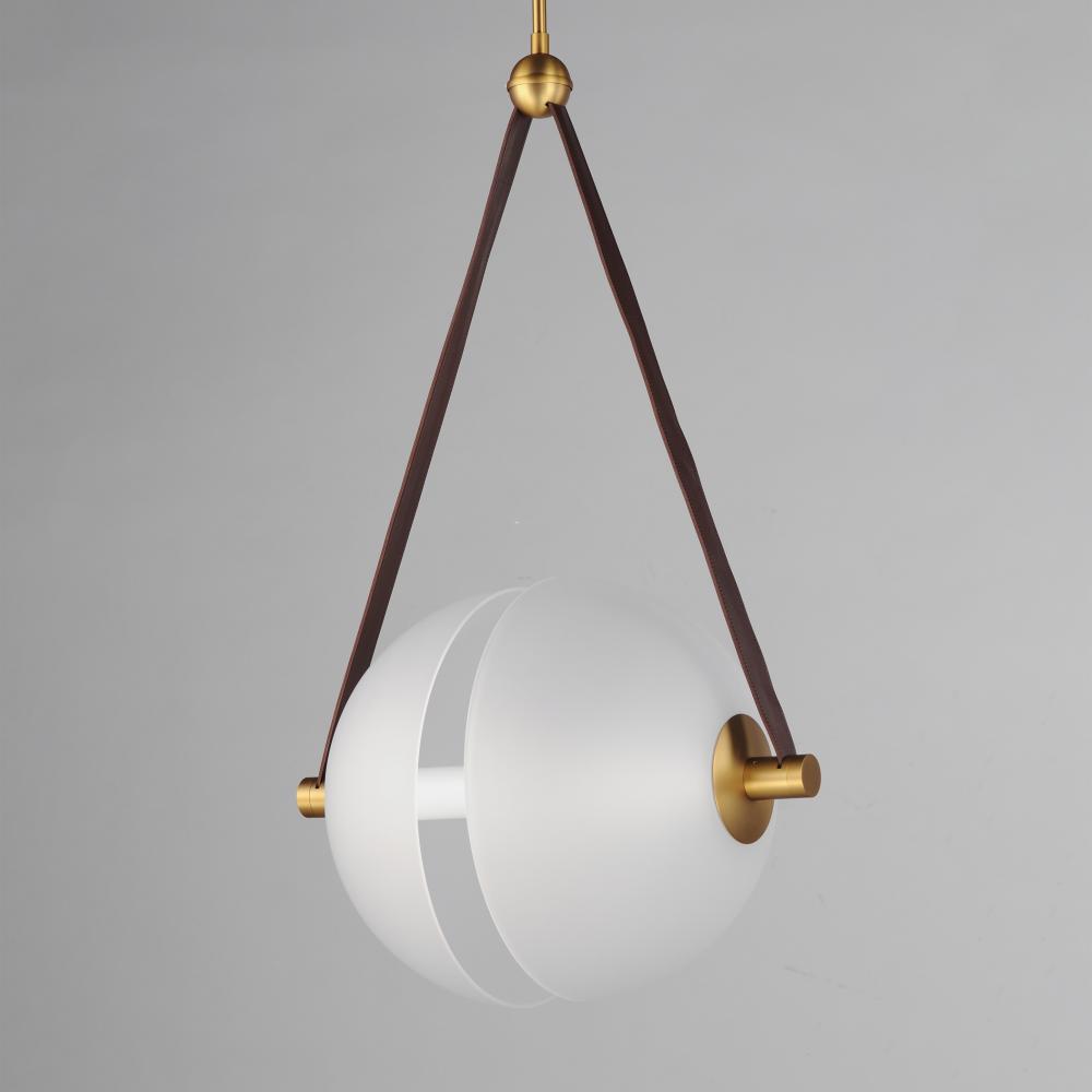 Send a message on the wire. Two semi-spherical frosted glass domes are separated by a tube of LED light and suspended by Tobacco Brown leather straps. The frames are complete in a contrasting Natural Aged Brass finish making the contemporary design softer