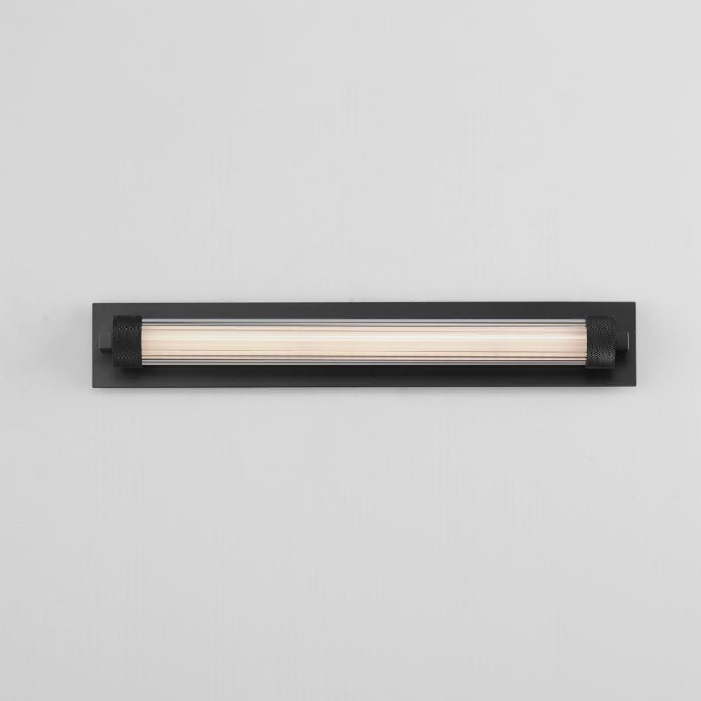 Clear ribbed glass encases a tube of opal white acrylic evenly illuminated by LED. The ends of the glass shade are fitted with knurled cylinder forms that suspend the sconces from their mounting plates. Dual mounted options are available for this series al