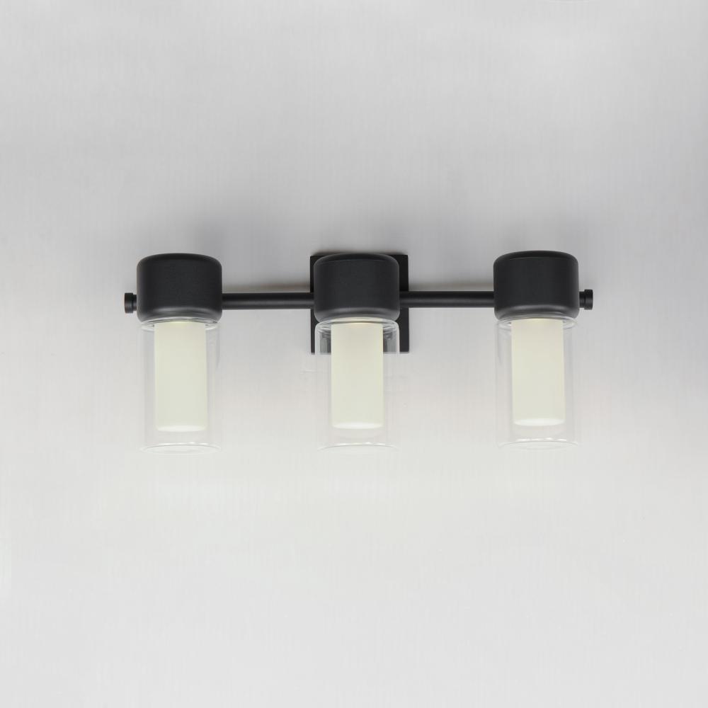 Dual Cylinder glass shades diffuse LED light bulbs concealed within rounded caps in Black powder coat. The single sconce is wet located with intention to be used outdoors, while the complementary 3-Light wall sconce is perfect for use in transitional to mo