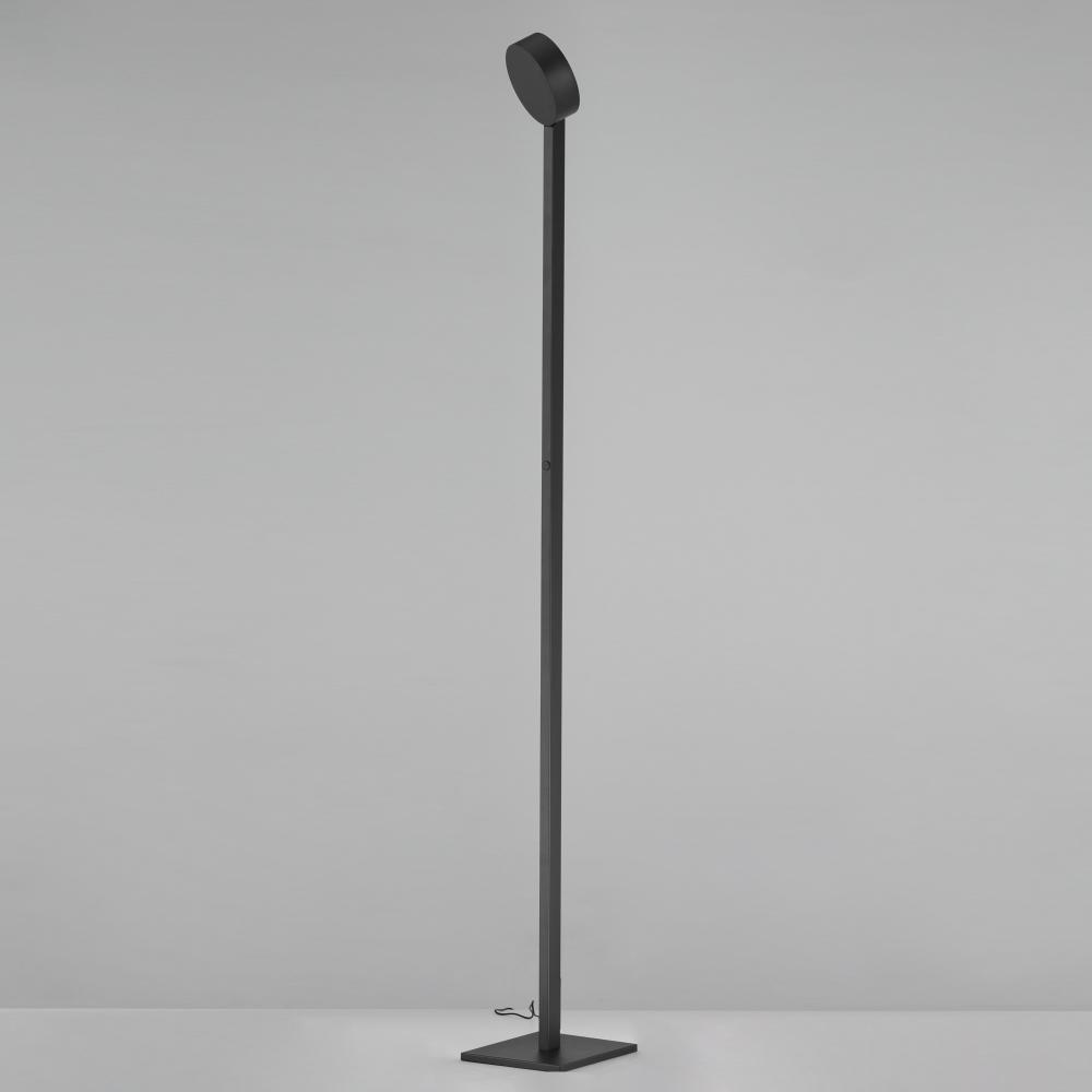 A modern matte black frame crafted with rectilinear tubing supports circular LED light modules. Designed to appear as if they are facing each other in an embrace, the modules create a harmonious and dynamic aesthetic. The two modules, positioned at opposit