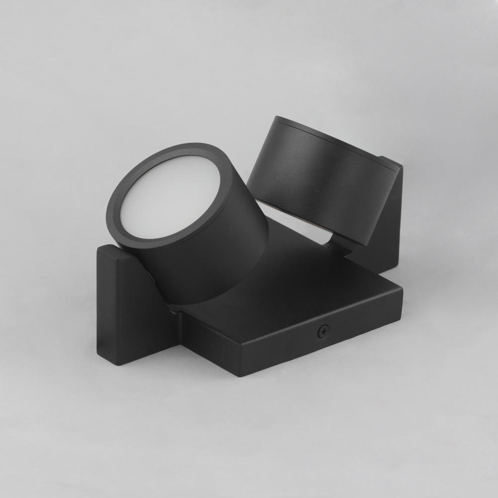 A modern matte black frame crafted with rectilinear tubing supports circular LED light modules. Designed to appear as if they are facing each other in an embrace, the modules create a harmonious and dynamic aesthetic. The two modules, positioned at opposit