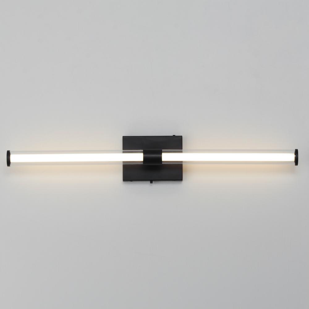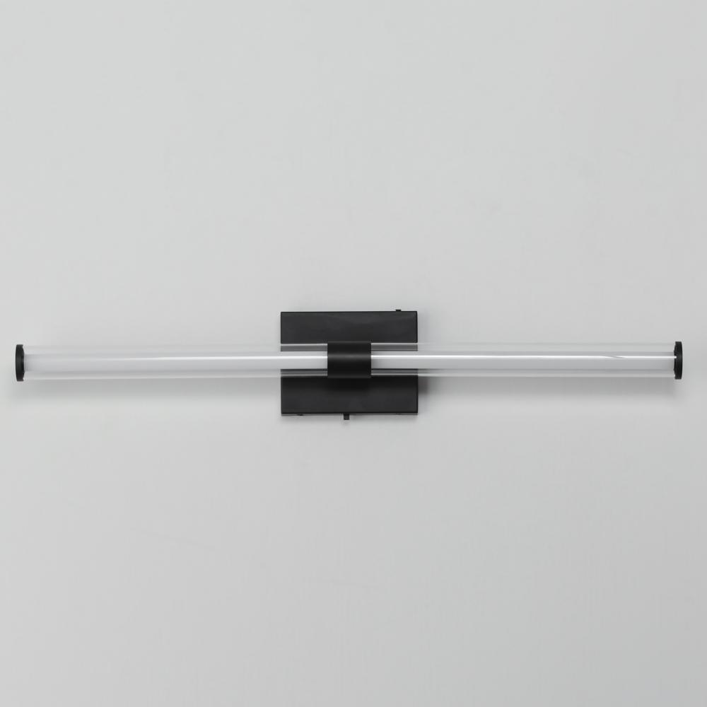 Within the void of clear glass, a white cylindrical tube of LED light extends in two directions. The evenly distributed light source can be adjusted to 5 selectable color temperatures, from warm 2700k to a cool 5000K and neutral white light sources in betw