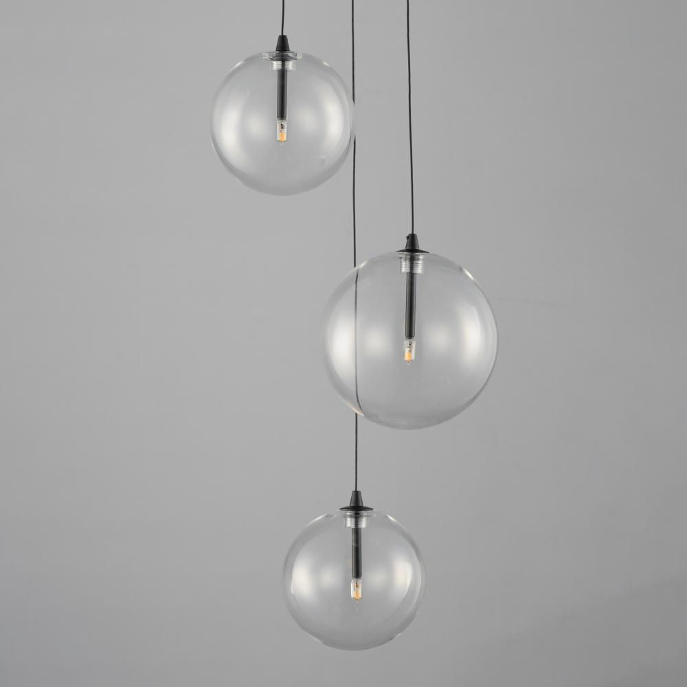 An airy configuration of Clear blown glass globe shades in various sizes suspend on thin low voltage wires. Thin tubes finished in Black or Gold descend into the center of the globes where a small G4 LED lamp provides a spark of light.