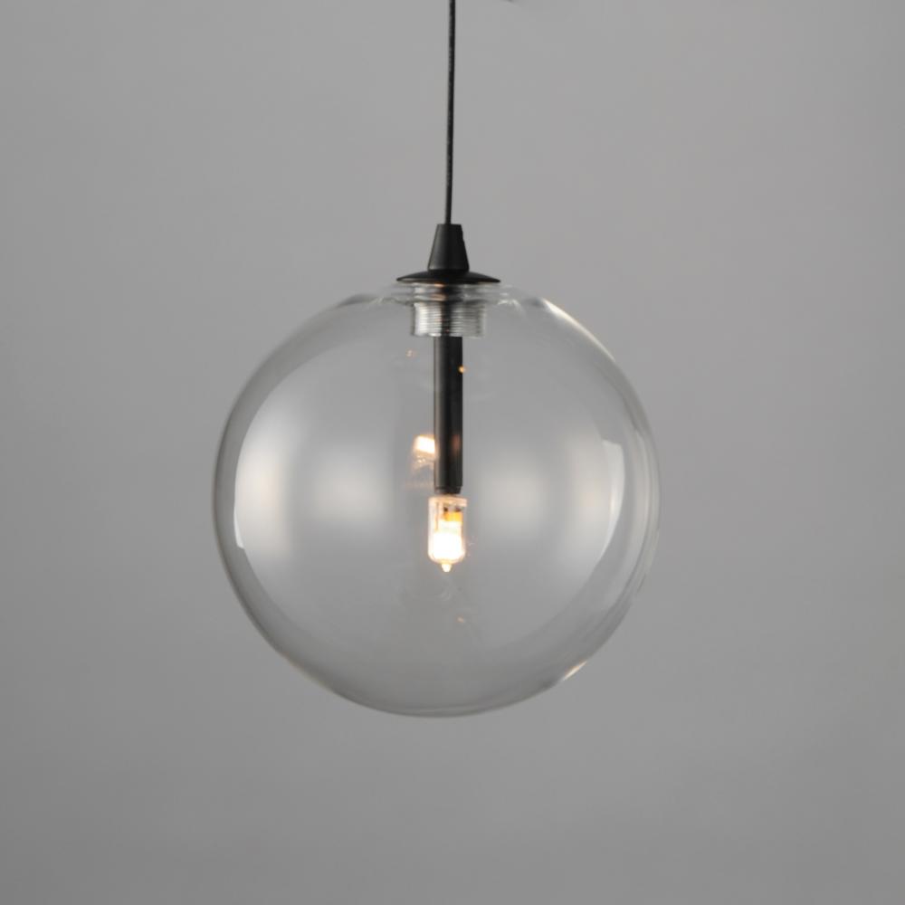 An airy configuration of Clear blown glass globe shades in various sizes suspend on thin low voltage wires. Thin tubes finished in Black or Gold descend into the center of the globes where a small G4 LED lamp provides a spark of light.