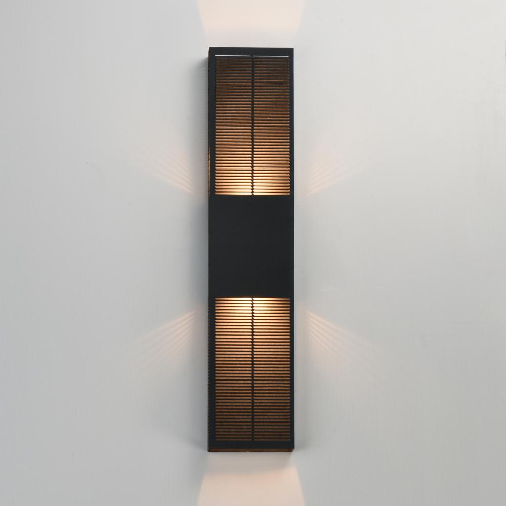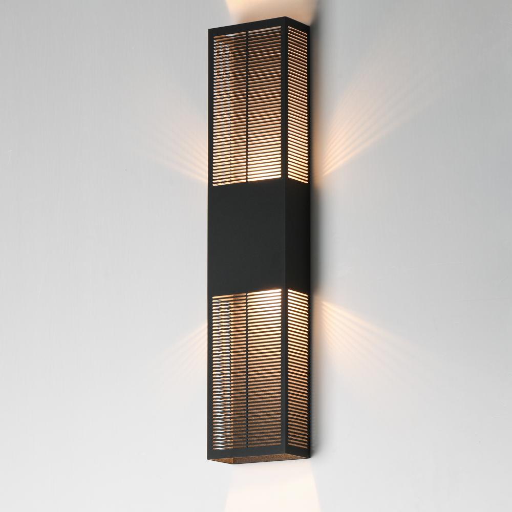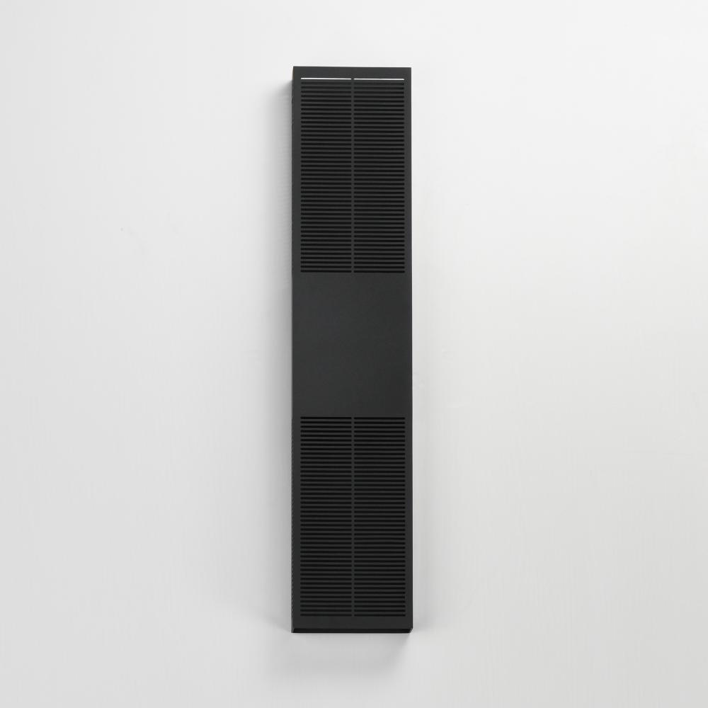 An array of precise slits are stacked in two columns on rectangular shade forms of various sizes. Housed in a blocked out space is a recessed LED light source that casts a filigree that radiate onto the surface surrounding the sconce making a dazzling disp