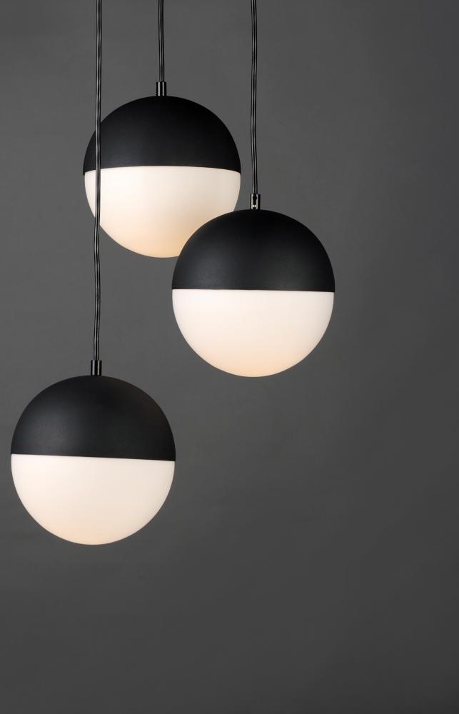 Spun metal semi spheres finished in Satin Nickel, Metallic Gold or Matte Black, cap a Satin White glass shade. Installed into each fixture is an omni-directional LED bulb that evenly illuminates the glass while providing long life operation.