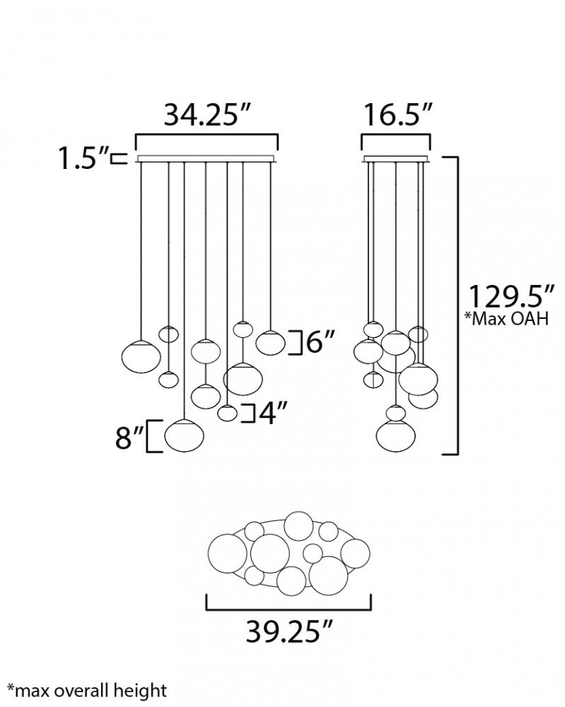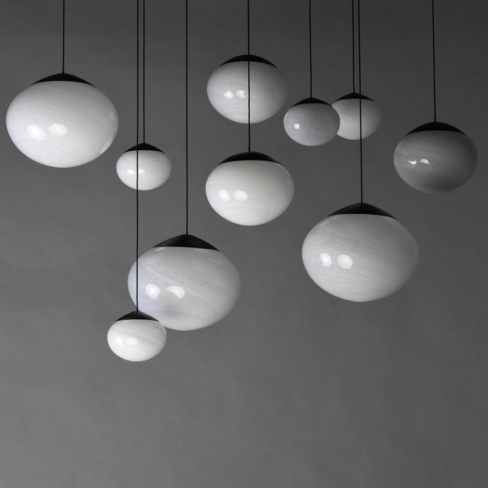 Oblong glass globe shades feature a intriguing Marble swirl pattern that obscures the integrated LED lighting within. Thin black electrical cords are easily adjustable. A larger oval 8-Light configuration features multiple sizes of the glass to create an i
