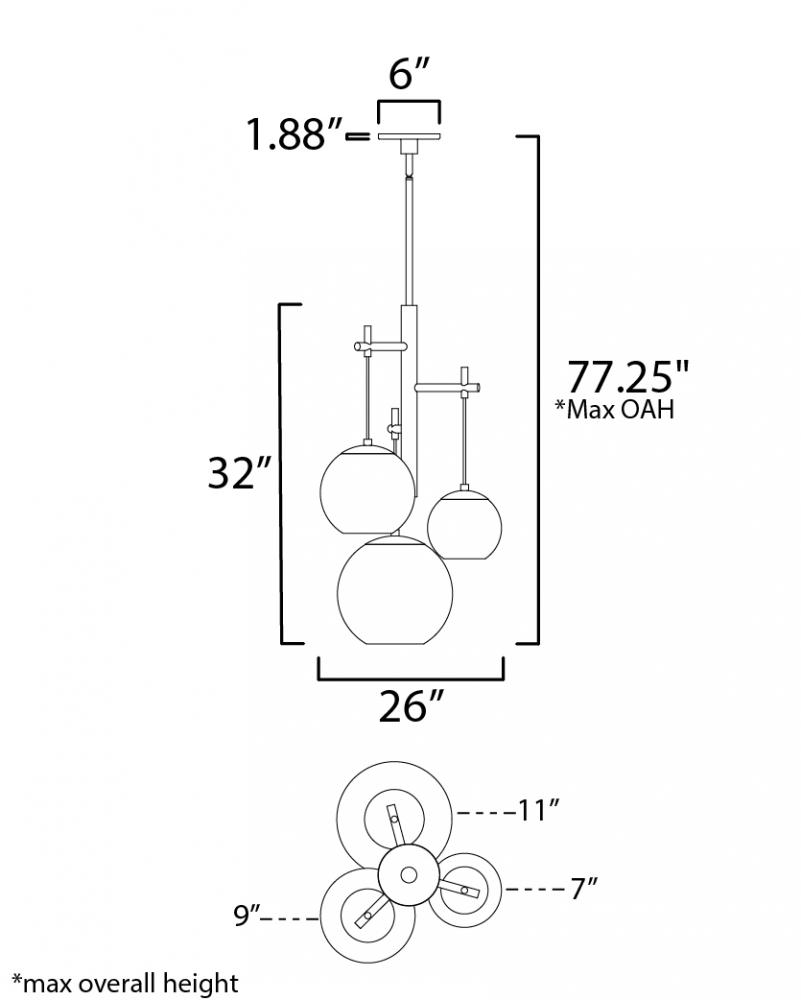 Thick Clear glass orbs suspend elegantly, each encasing a small aluminum sphere encompassed within. Discretely recessed, dedicated LEDs provide ample lighting without glare. The multi-light pendants feature three orb sizes branching out from a central stru