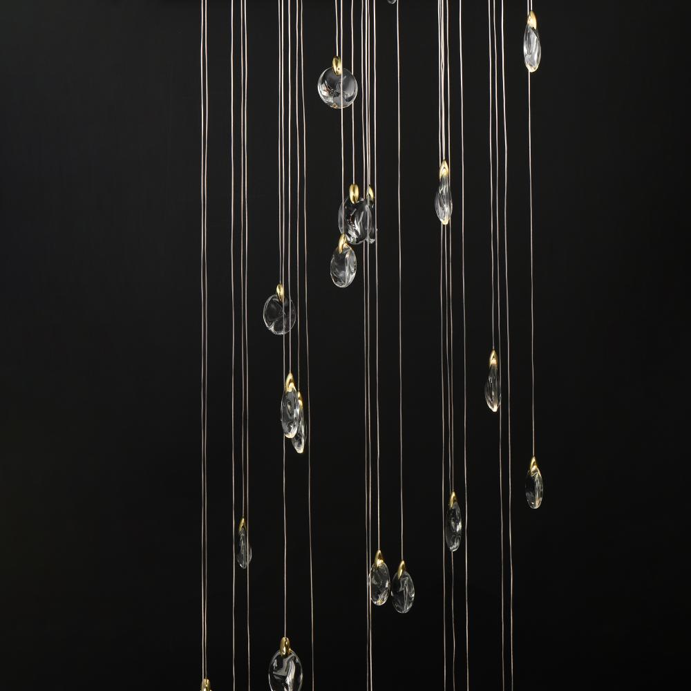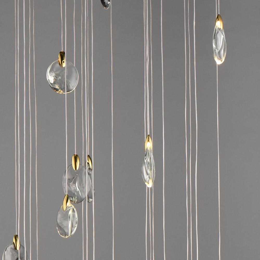 As if naturally formed from the ebbing shores of a riverbed, smooth and irregularly shaped crystal pebbles are suspended by cast metal clasps in a Polished Gold finish. Discreetly illuminated by concealed LED light sources within the clasps, additional dow