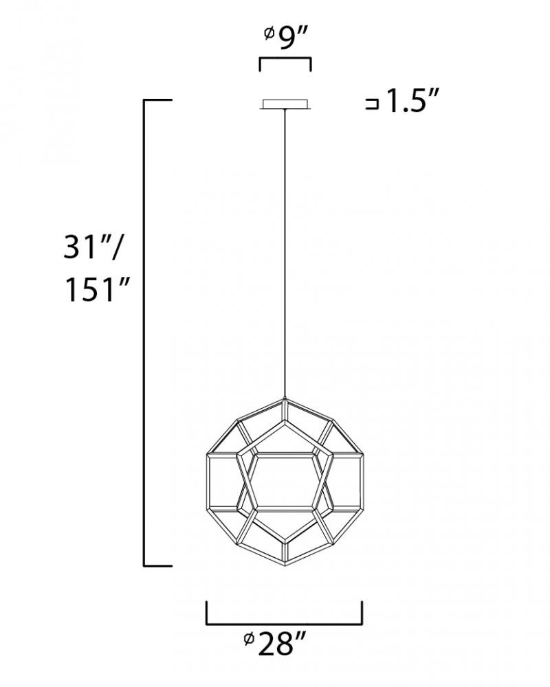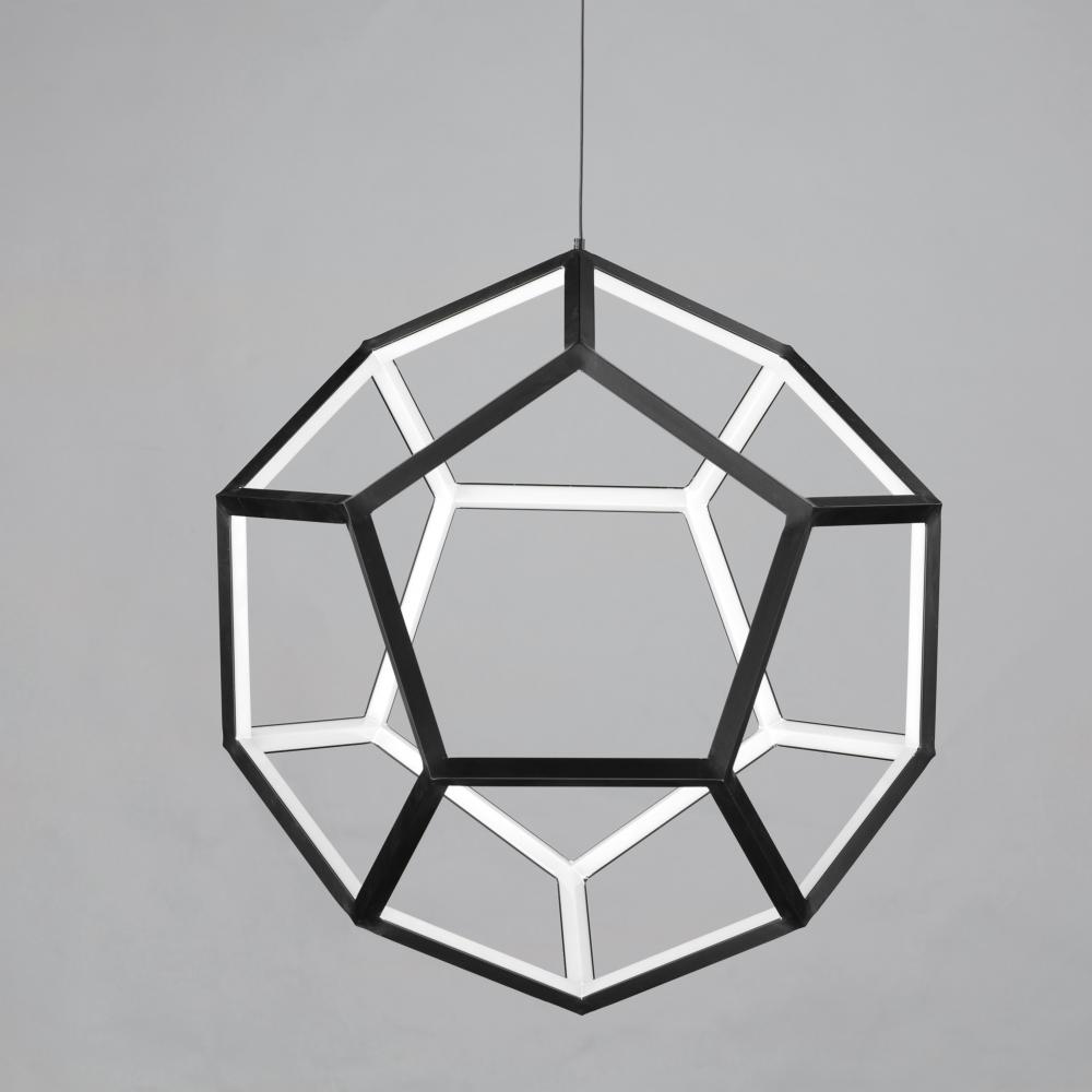 Formed by a series of Black pentagons into a spherical shape, this geometric collection is illuminated from the inside for a dramatic lighting effect. Available in 3 sizes ranging from 22" to the dramatic 40" large pendant.