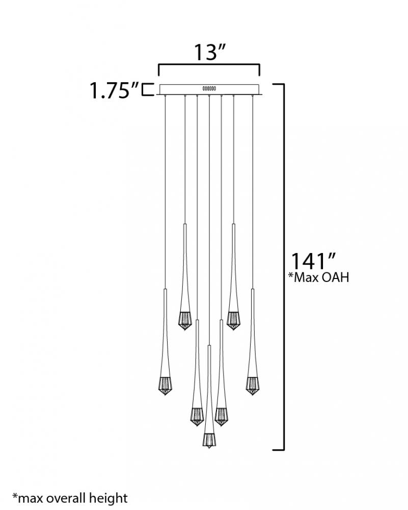 An elongated profile with piercing statement, this series of pendants feature thin black wires that support a tapered metal pendant. Recessed in this form is a high powered LED that illuminates a brilliantly faceted crystal element with etched details insi