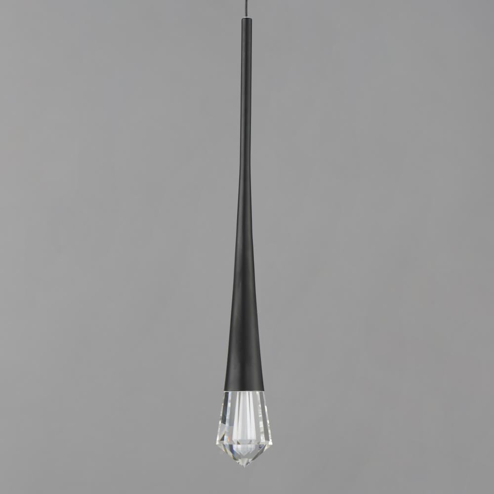 An elongated profile with piercing statement, this series of pendants feature thin black wires that support a tapered metal pendant. Recessed in this form is a high powered LED that illuminates a brilliantly faceted crystal element with etched details insi