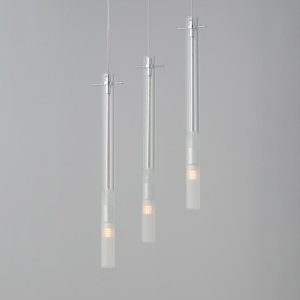 Slender Clear glass tubes sheath a Polished Chrome rod that supports small LED lamps. The glass is etched at a dividing line in the glass to softly diffuse the light. Available in two lengths of glass tube, the pendants are also available in multiple confi