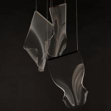 An airy arrangement of abstract forms, the Rinkle pendants feature sheets of transparent acrylic shaped by hand. The light guided acrylic captures the glow of energy efficient LEDs recessed within strips of shining stainless steel, obscuring the source of
