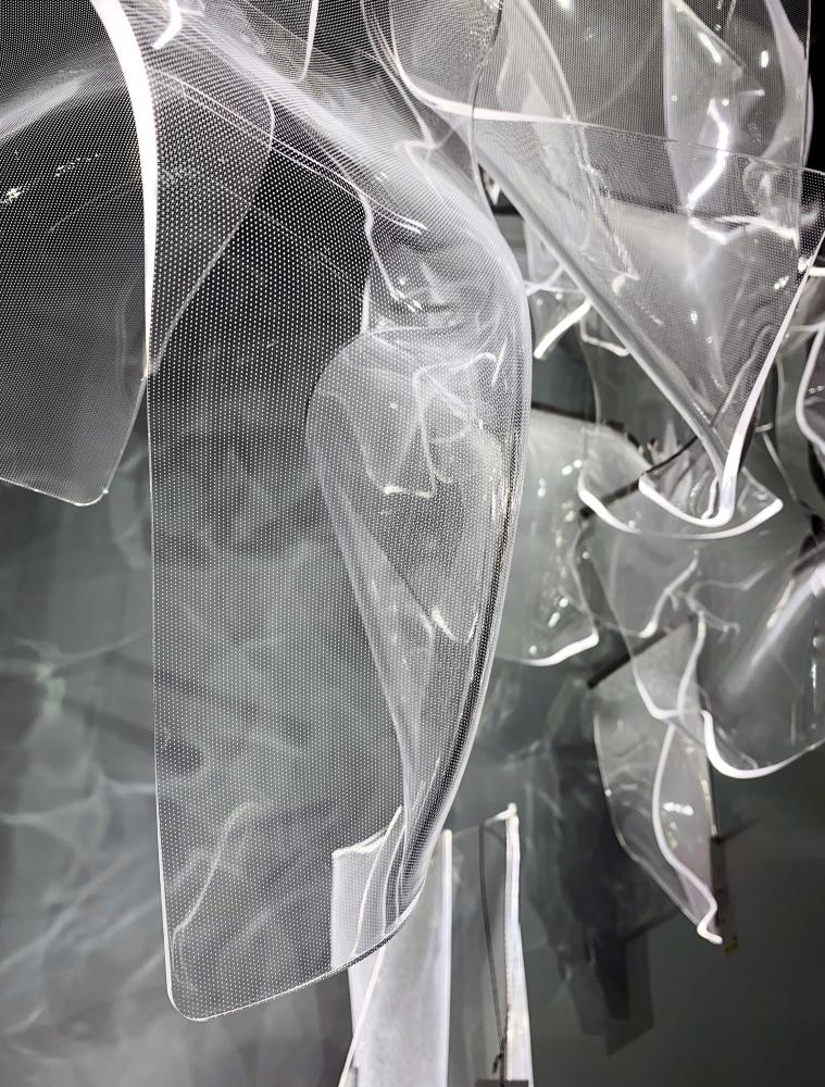 An airy arrangement of abstract forms, the Rinkle pendants feature sheets of transparent acrylic shaped by hand. The light guided acrylic captures the glow of energy efficient LEDs recessed within strips of shining stainless steel, obscuring the source of