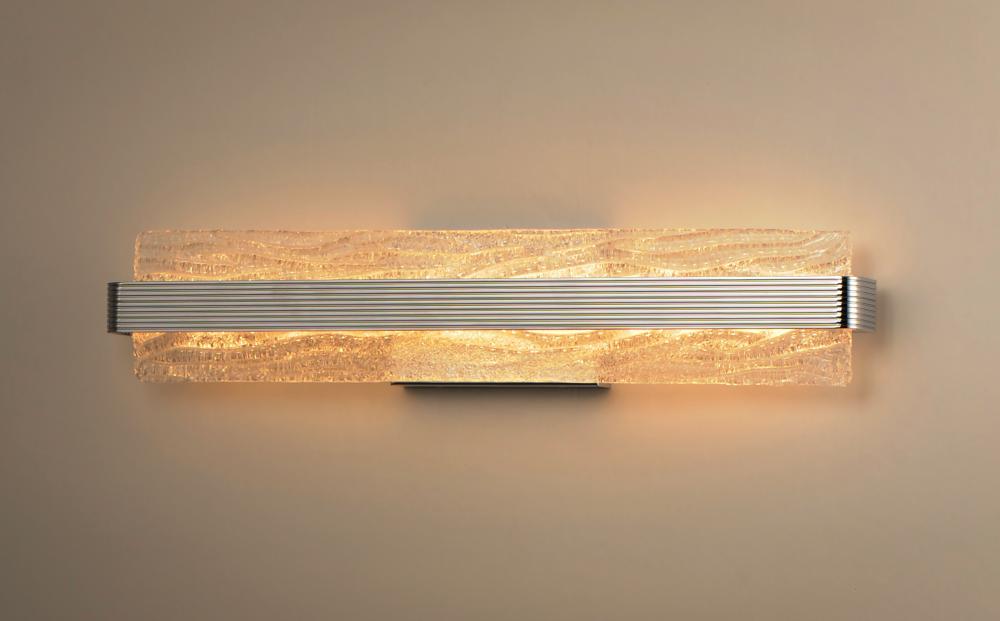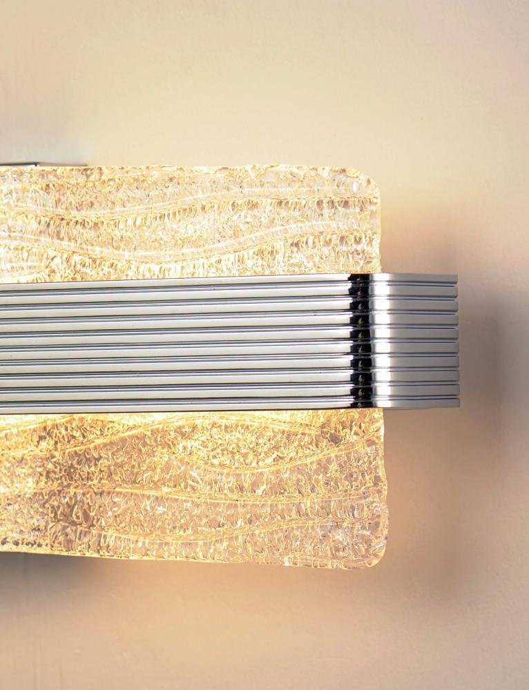 A rippled horizontal bar in Polished Chrome illuminates hand-crafted artisanal Piastra-style glass. The glass's intricate texture creates an interesting light effect on the wall. Can be mounted either vertically as a wall sconce or horizontally over a