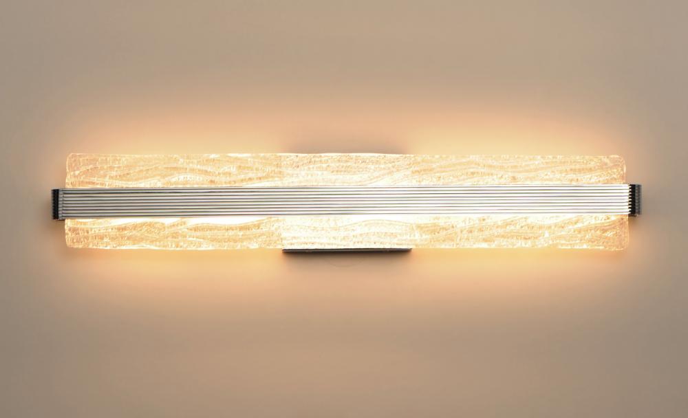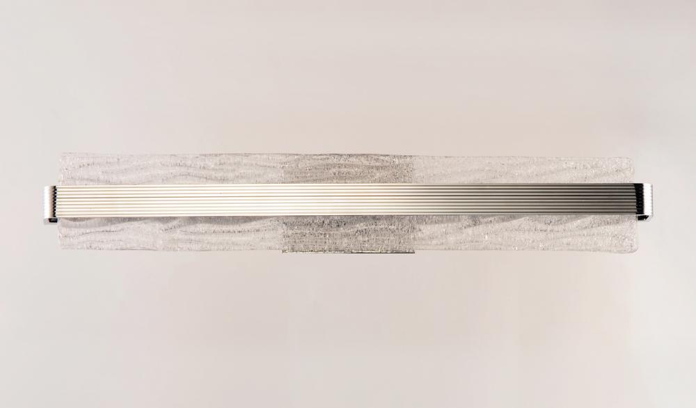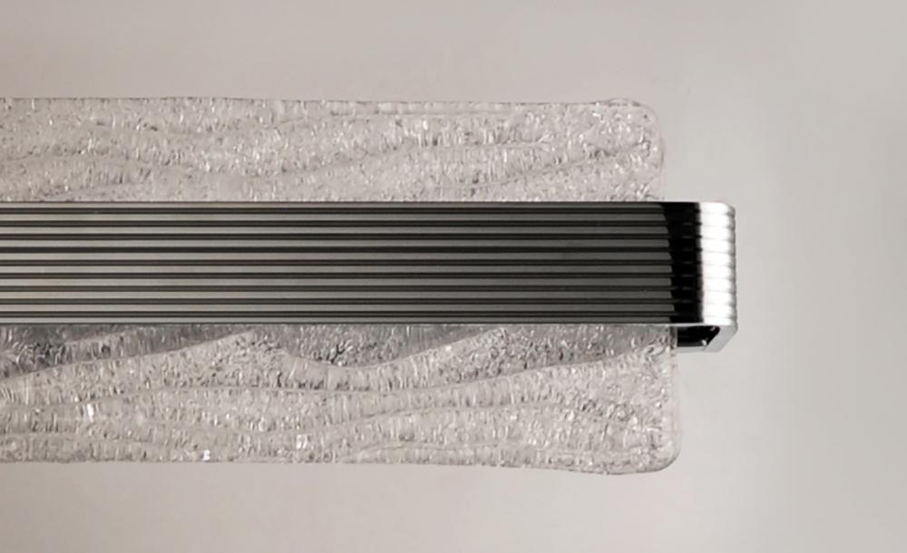 A rippled horizontal bar in Polished Chrome illuminates hand-crafted artisanal Piastra-style glass. The glass's intricate texture creates an interesting light effect on the wall. Can be mounted either vertically as a wall sconce or horizontally over a