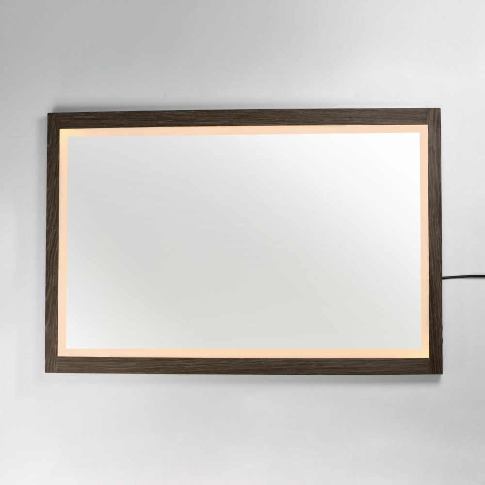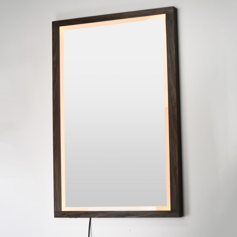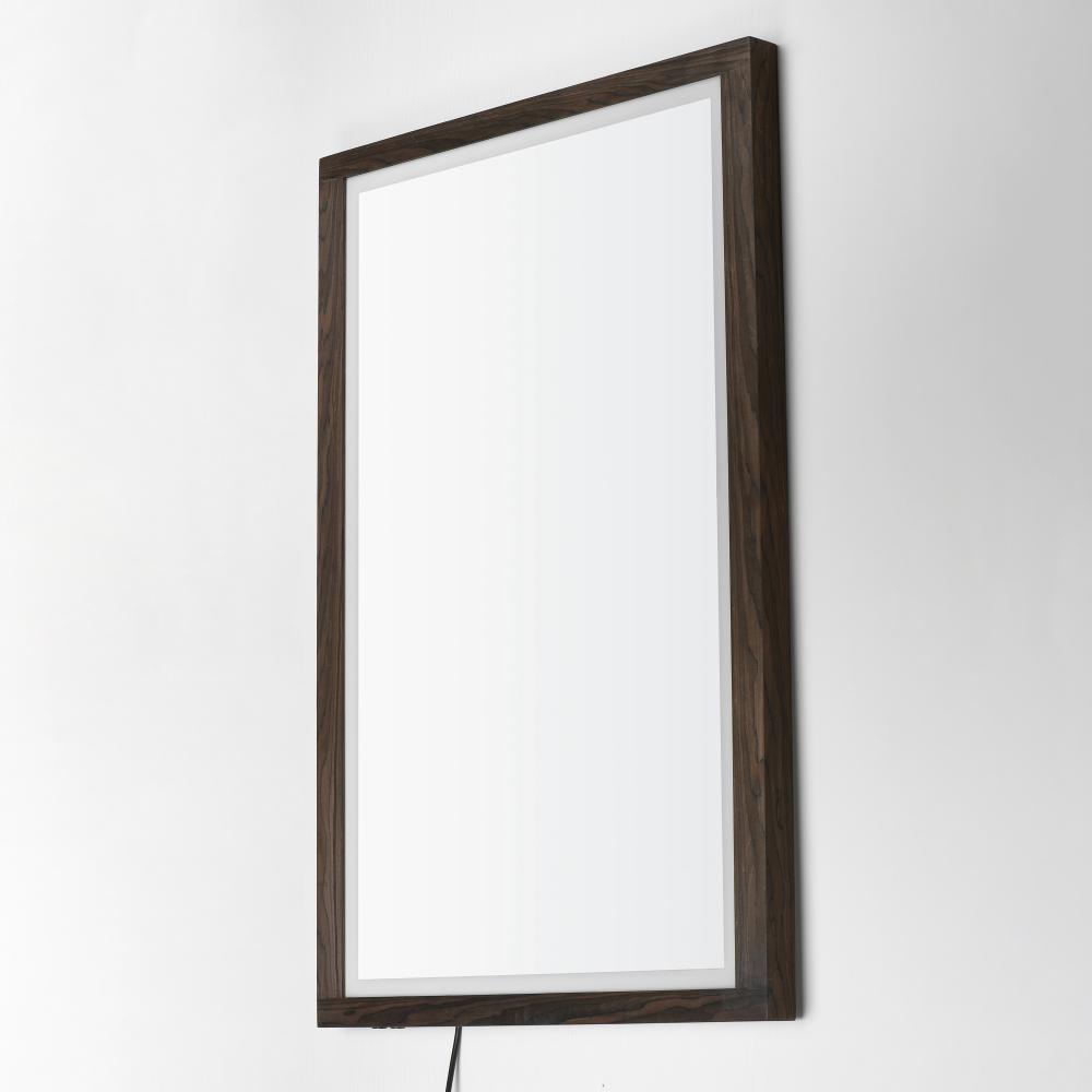 A wood-framed mirror is offered in a choice of Walnut or Distressed Oak, combining natural elements with modern functionality. A 2-inch frosted band along the frame's interior is backlit with LEDs, providing optimal illumination above a vanity. A discr
