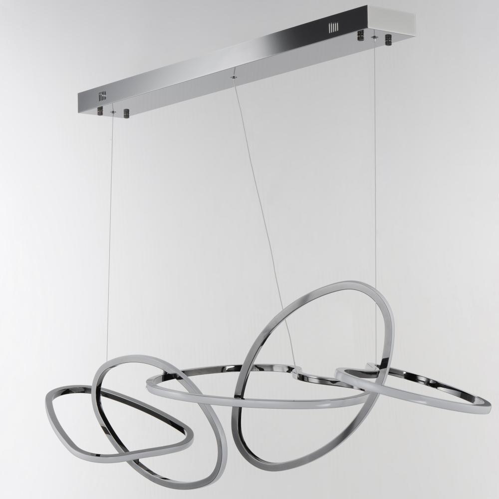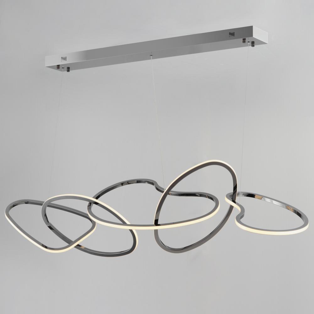 Abstract shapes of stainless steel are finished in Brushed Champagne or Black Chrome and intersect to create an intriguing sculpture of light. Unity provides both art and illumination for those searching for a unique lighting piece.