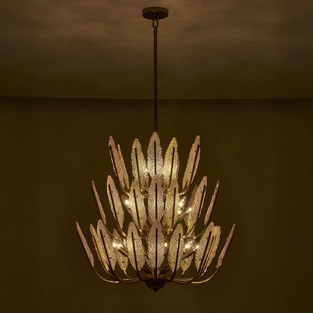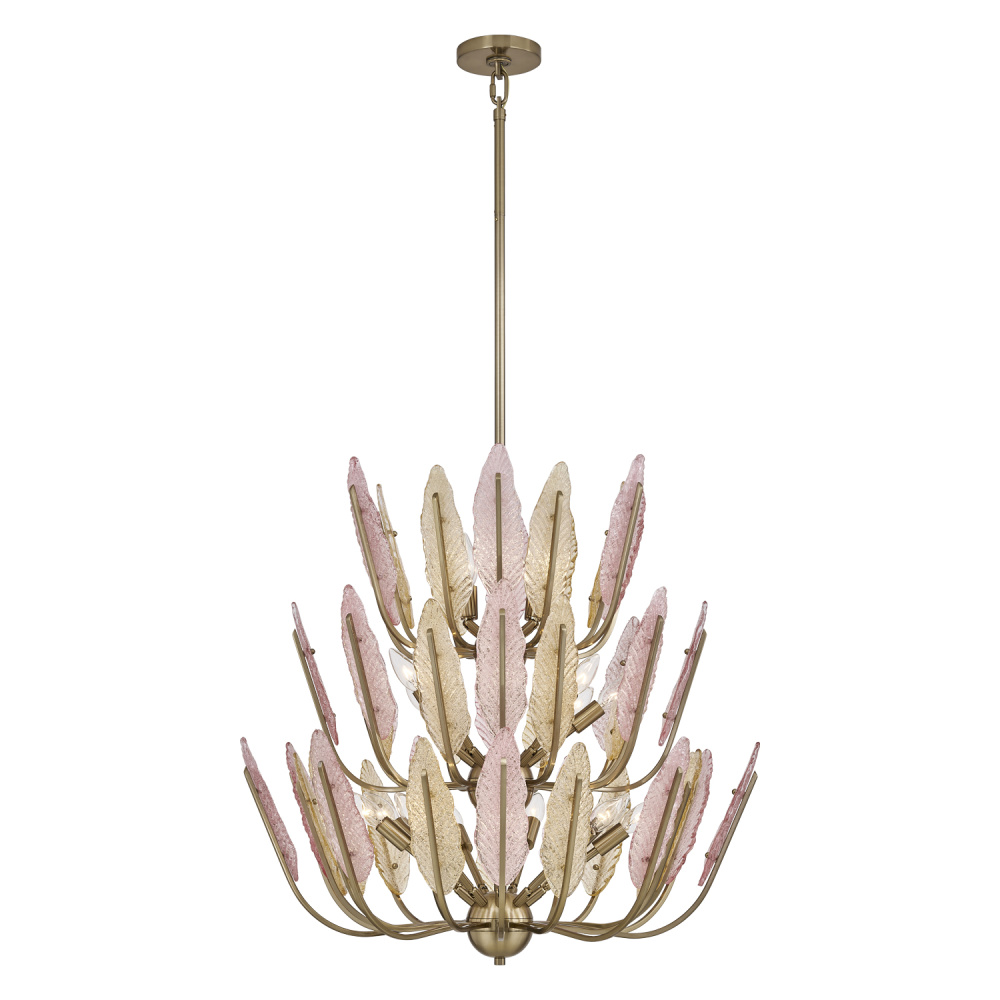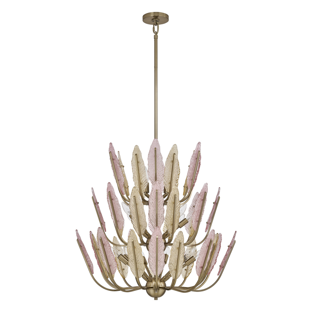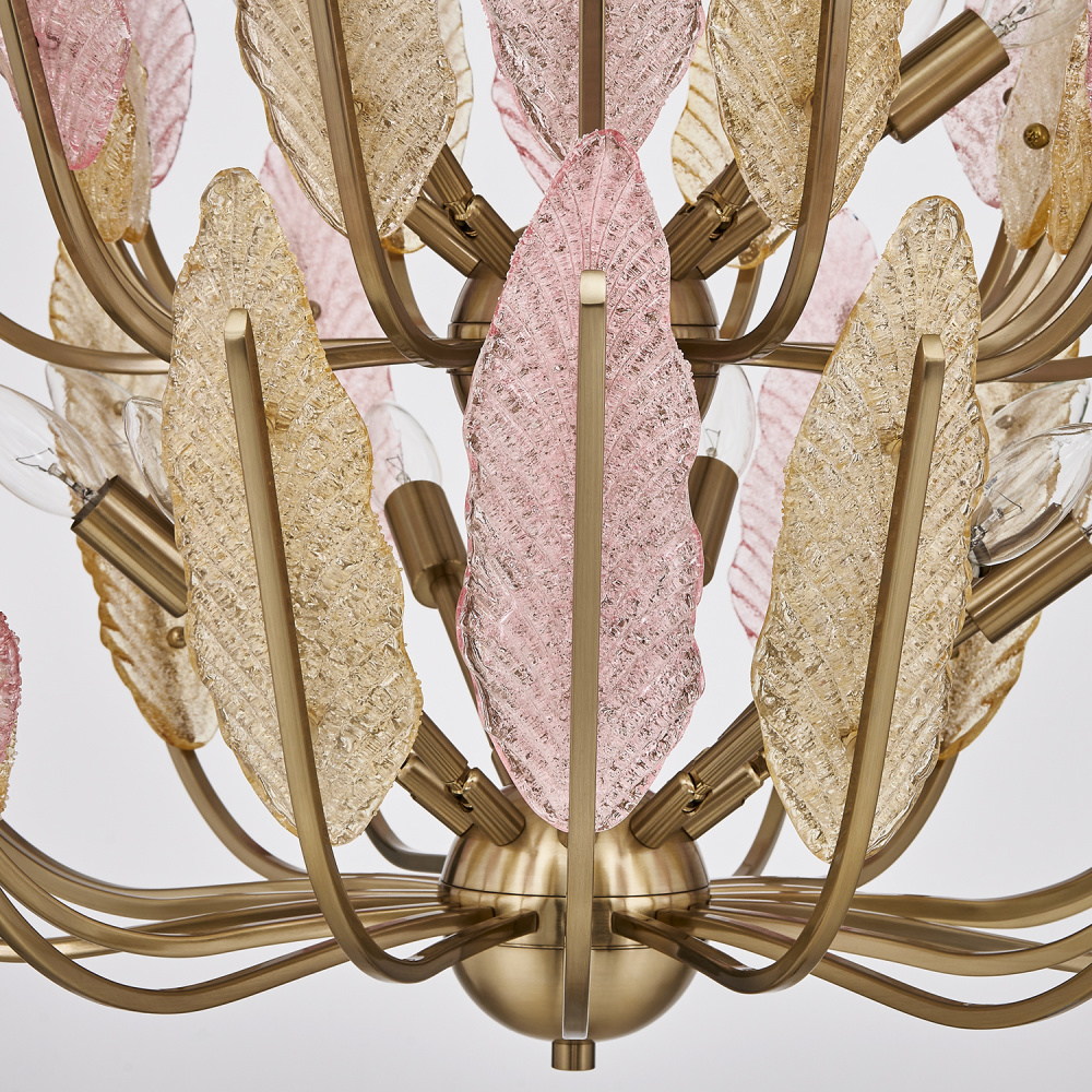 colors and lightness to any space. Numerous gold and pink tinted glass leaves feature a dual sided surface,