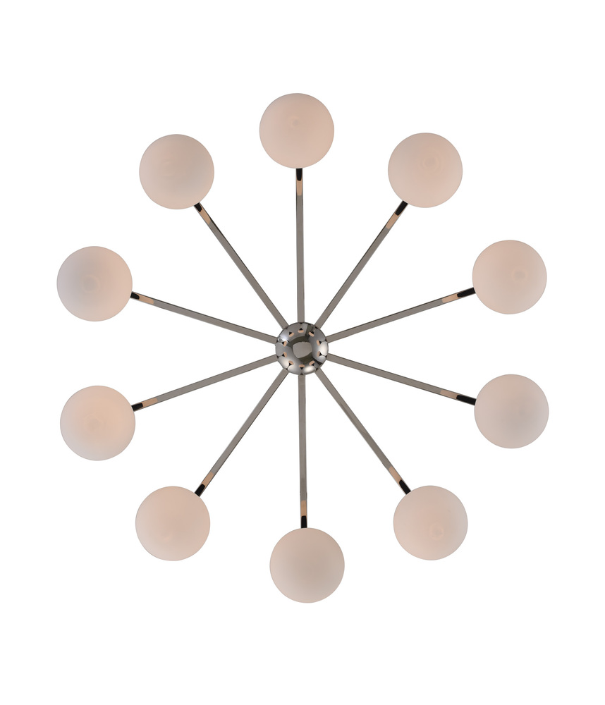 Mid-Century Modern inspired design featuring a trendy two-tone Matte Black and Polished Nickel finish with etched opal glass globes.