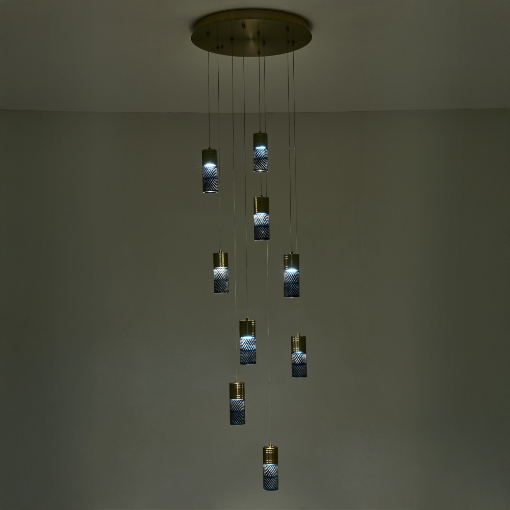 Inspired by the traditional Japanese craft of Edo Kiriko, the indigo colored 24% lead crystal diffusers of this fixture family features precise, herringbone cuts that reveal a clear layer underneath. The aluminum, Winter Brass (WB) body holds each glass in place, and the LED light sources provide ample downlight, adding a functional, yet colorful statement fixture to any space.