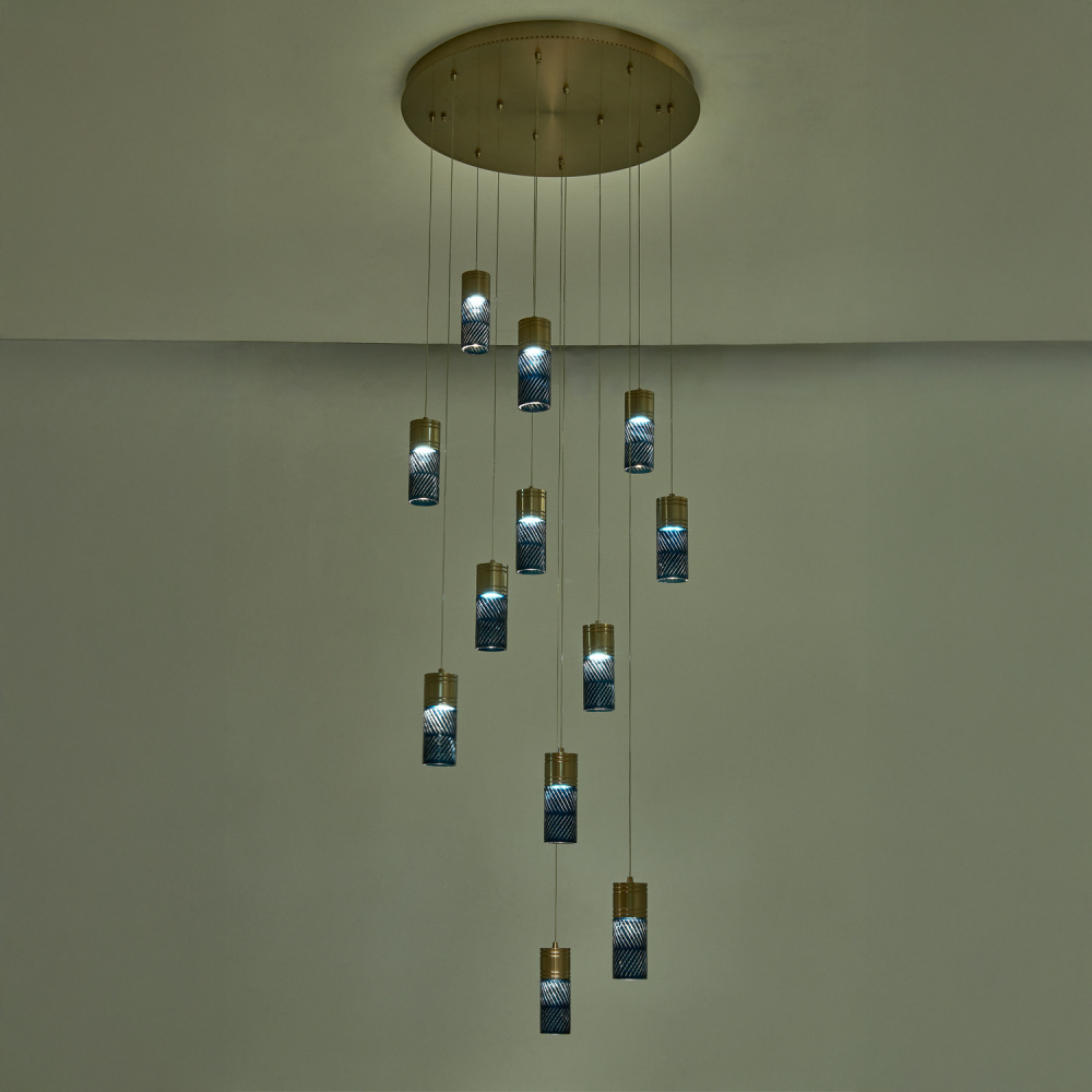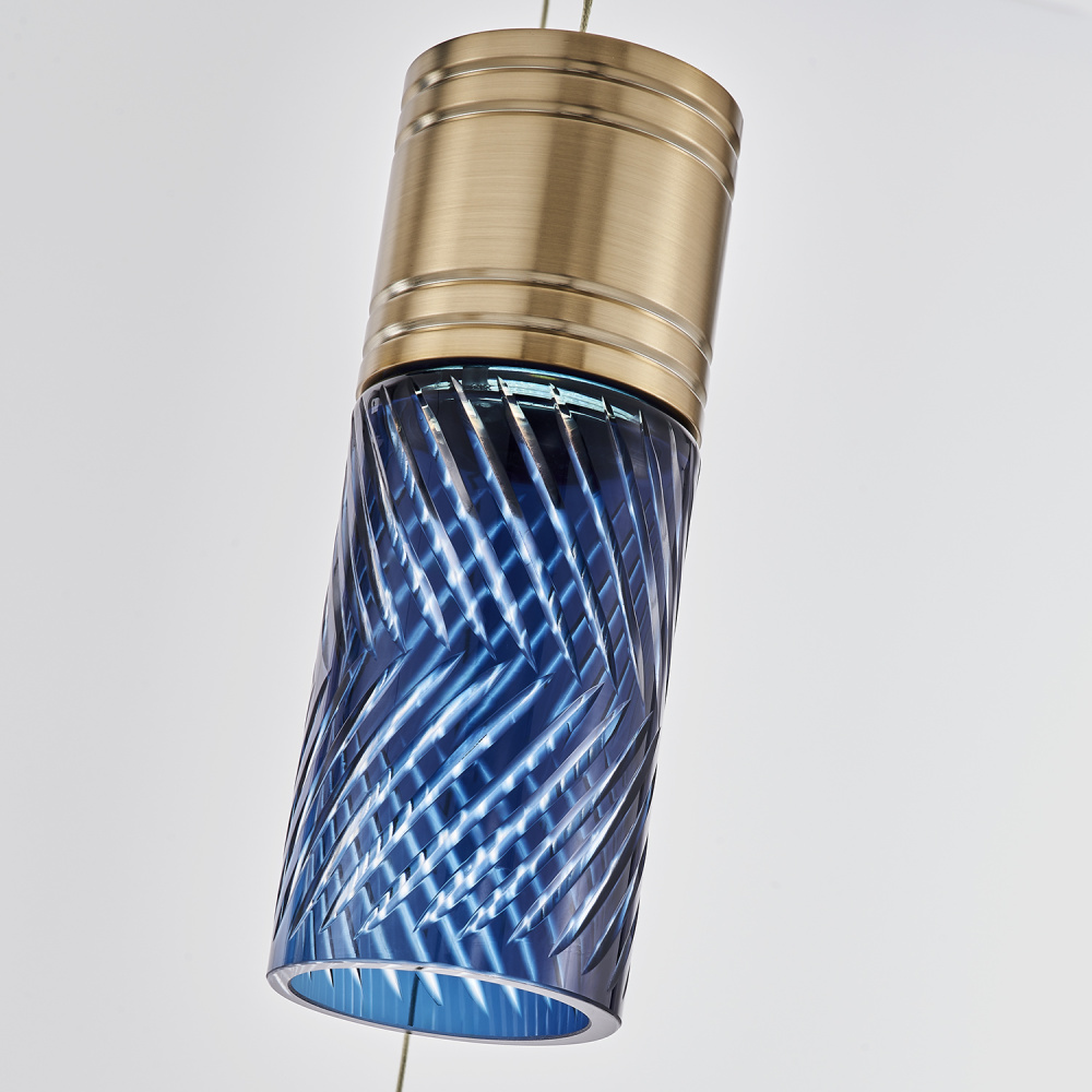Inspired by the traditional Japanese craft of Edo Kiriko, the indigo colored 24% lead crystal diffusers of this fixture family features precise, herringbone cuts that reveal a clear layer underneath. The aluminum, Winter Brass (WB) body holds each glass in place, and the LED light sources provide ample downlight, adding a functional, yet colorful statement fixture to any space.