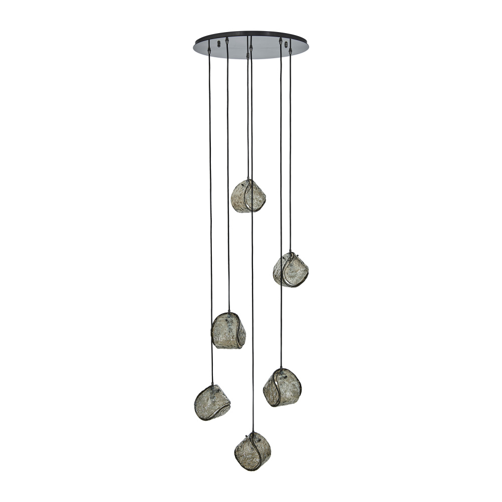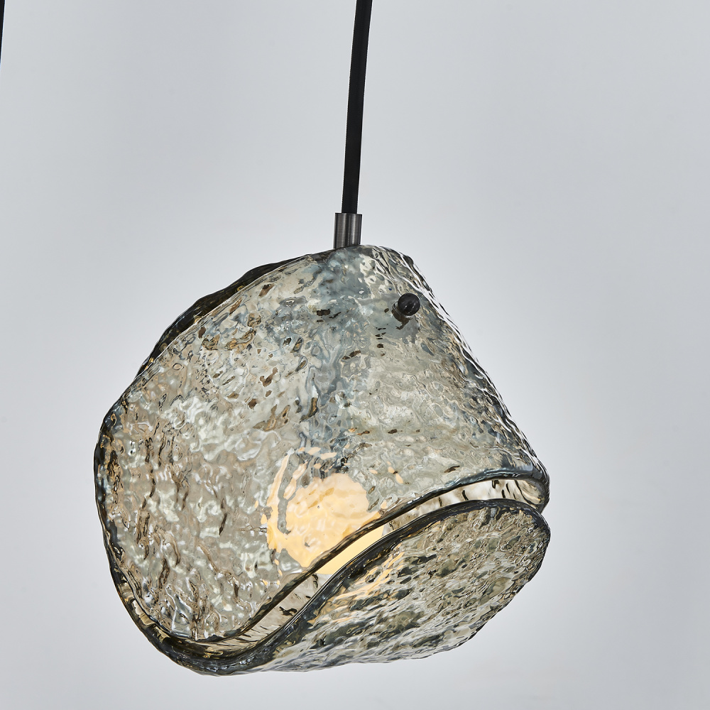 This versatile and contemporary family features a variety of multi drop arrangements and color options to add a designer touch to any space. Inspired by the construction and pattern of the tennis ball, this unique, textured glass comes in clear or smoke, and is paired with a coordinating colored power cord and a Winter Brass (WB) or Satin Black Nickel (SBN) finish.