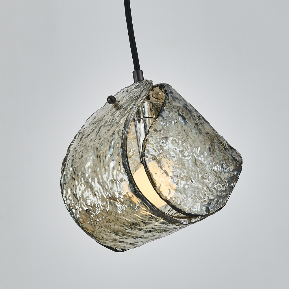 This versatile and contemporary family features a variety of multi drop arrangements and color options to add a designer touch to any space. Inspired by the construction and pattern of the tennis ball, this unique, textured glass comes in clear or smoke, and is paired with a coordinating colored power cord and a Winter Brass (WB) or Satin Black Nickel (SBN) finish.