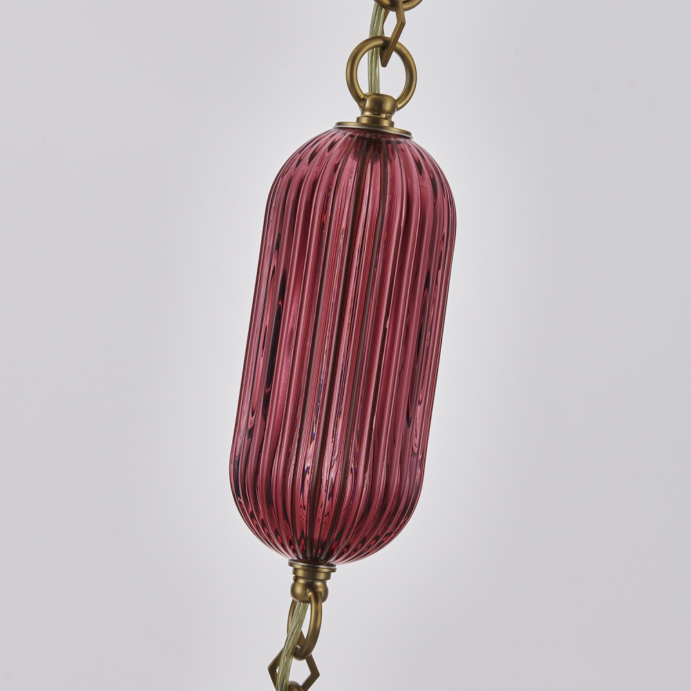 Infuse your interiors with dramatic elegance and retro charm with the stunning Verde collection, featuring a True Satin Brass (STB) finish with your choice of either fluted green or magenta glass. Each richly textured glass dish cradles a glowing orb bulb, casting a warm, inviting light and creating a play of color and shadow. The overall composition and decorative chain highlight an exquisite balance between vintage glamour and modern sophistication, perfect for dining rooms, grand entryways, or boutique hospitality settings. Whether illuminated or admired unlit, this collection captivates with its bold color and refined craftsmanship.