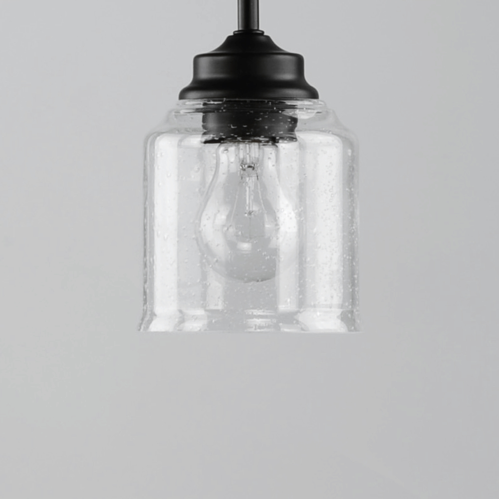 A modest frame of steel tubing gently bends to support a cluster of Clear Seedy bell-shaped glass. Similarly the bobeches and other metal accents echo that traditional bell shape creating an instant classic. An easy choice with transitional appeal, choose