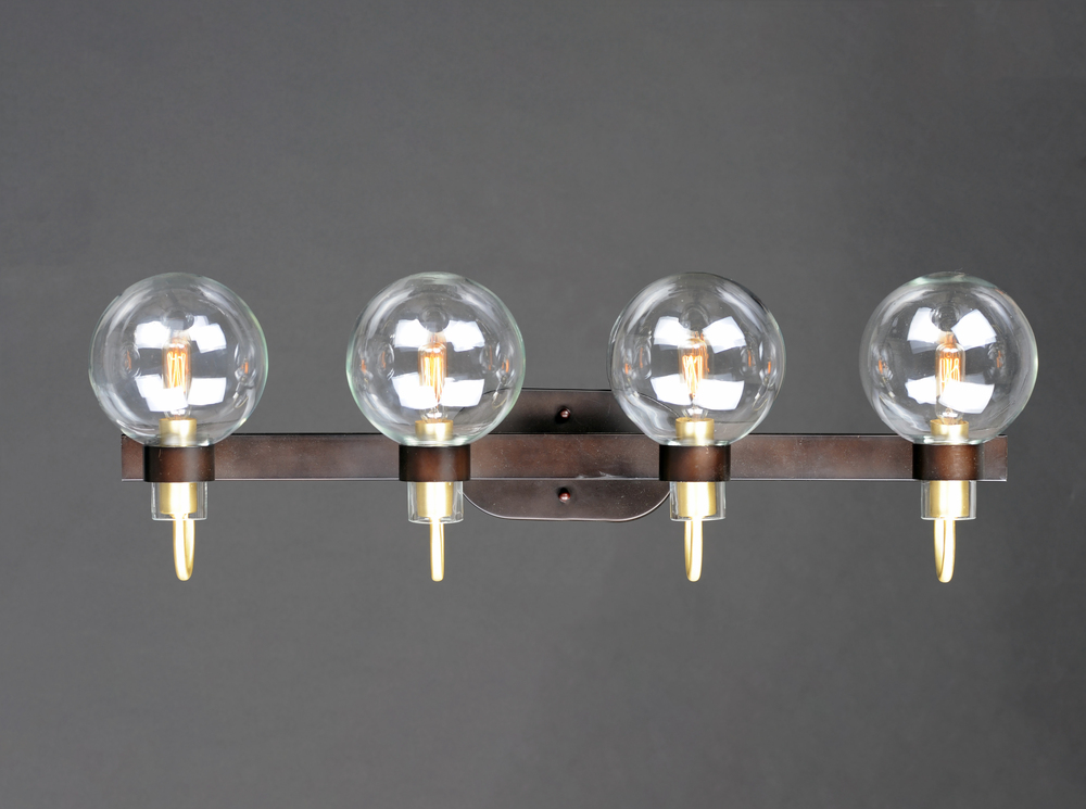 This classic Mid Century Modern design features a frame finished in a combination of Bronze and Satin Brass. The arms terminate at rings that support Clear heavy blown glass shades which were prevalent in this era.