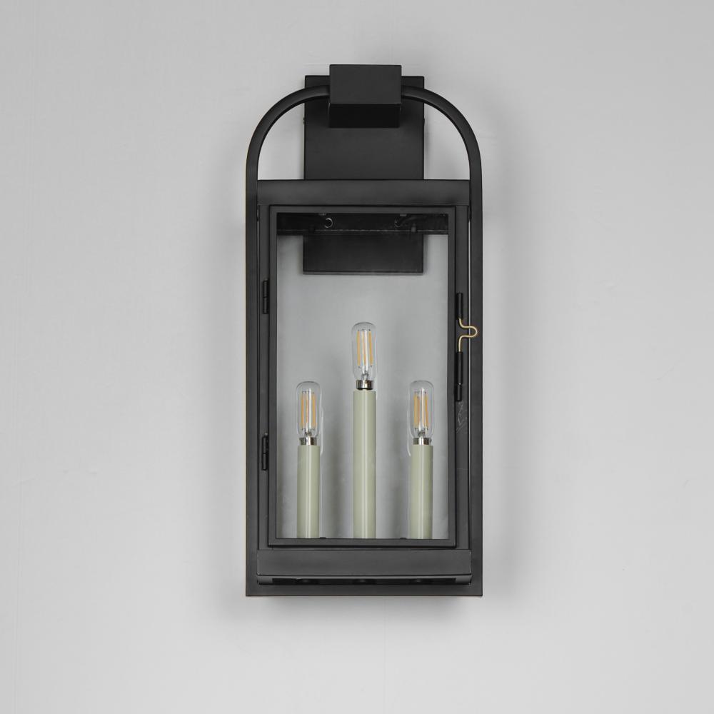 Inspired by classic English lantern design, this collection of outdoor sconces have been streamlined for modern appeal. A convenient, and quaint front door latch allows you to clean and maintain the fixture. Finished in a clean, Matte Black finish with bra