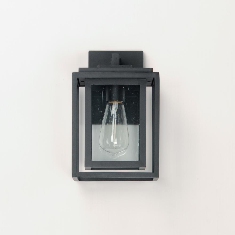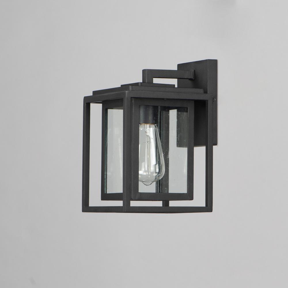 A dual framed structure creates dimension on these outdoor lighting fixtures that is both contemporary and transitional. The construction consists of two frames of square tubing and squared components. The inner frame's Clear Seedy glass reduces gla