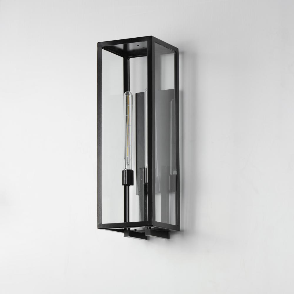 An elongated rectangular shaped design that is both minimalist and industrial. Die cast frames of Dark Bronze support Clear glass panels that provide an unobstructed view of the lantern's interior. Customize with your choice of lamps from vintage to tu