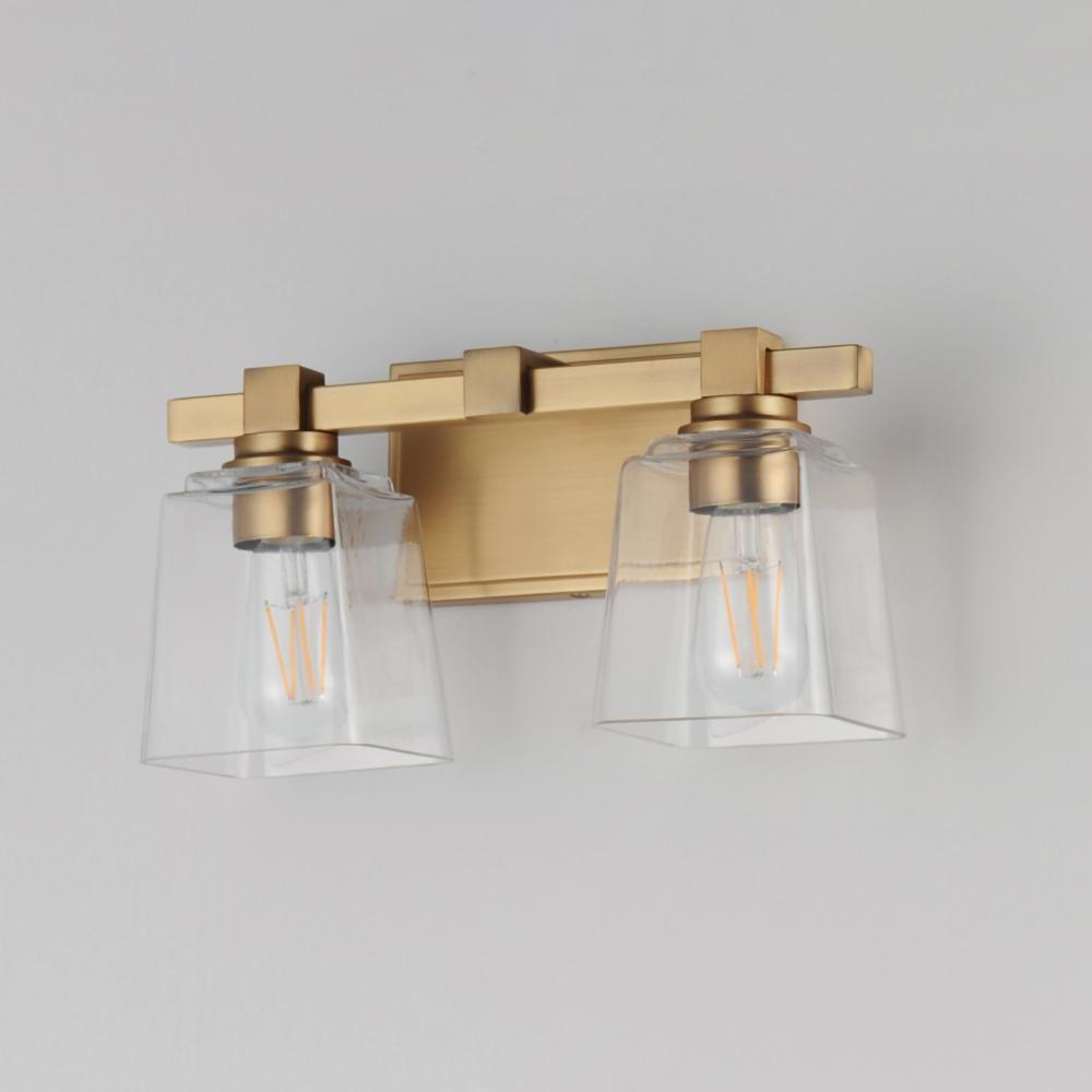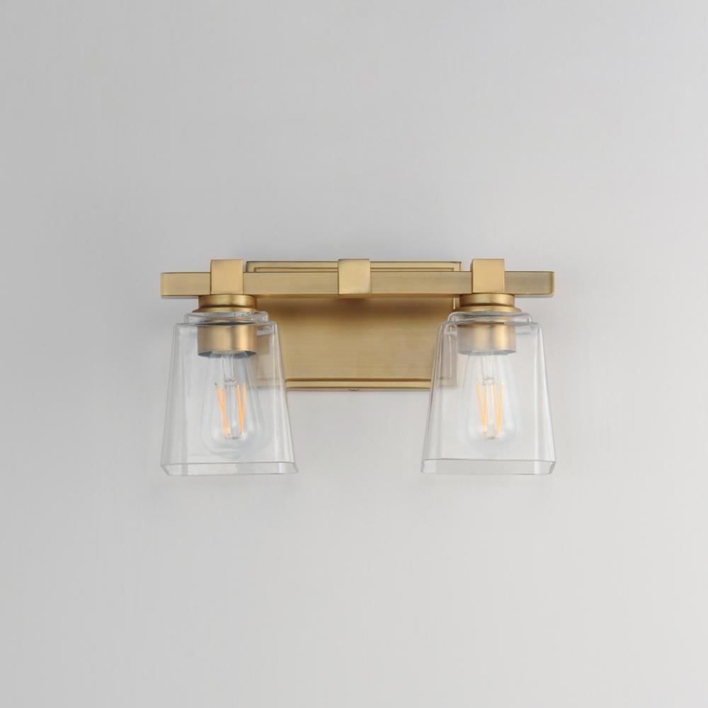 A composition of square forms that feature a Clear tapered square glass shade, these bath vanities provide a transitional design that suits both modern and traditional spaces. Available in Matte Black, Polished Chrome, Satin Nickel, and Natural Aged Brass.