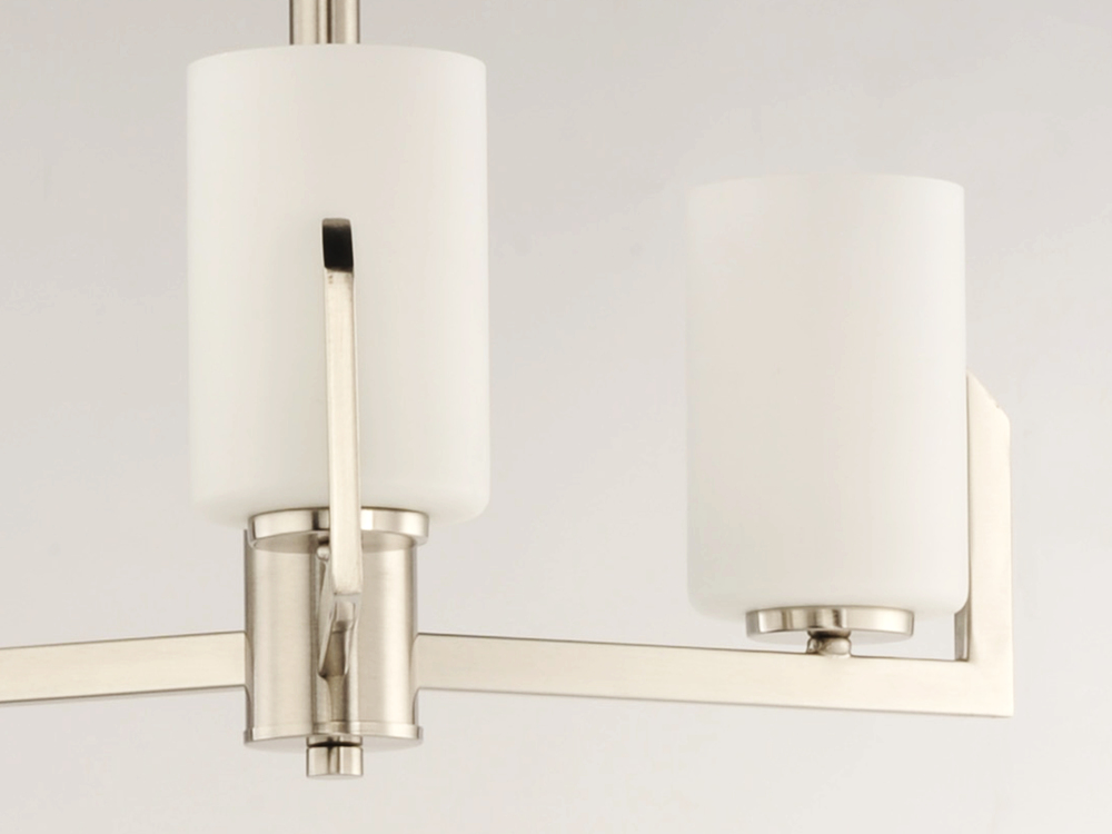 Inspired by the Modernist architect Edward Dart, this collection features straight line frames finished in Satin Brass, Satin Nickel, or Matte Black that support Satin White glass cylinders for a clean and modern look. The frames' ends turn up before t
